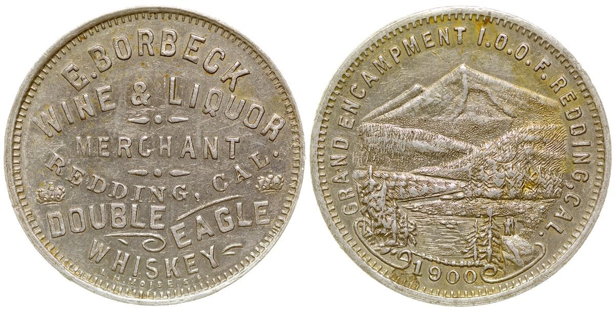 A commemorative / advertising token for E. Borbeck Wine & Liquor Merchant highlighting Double Eagle Whiskey on one side and a Vignette of Redding on the other. Double Eagle Old Bourbon was a premium trademarked product of Royal Eagle Distilleries in San Francisco. See Barnett pg. 57. E. Borbeck / Wine & Liquor / Merchant / Redding Cal. / Double Eagle / Whiskey // Grand Encampment I.O.O.F. Redding, Cal. / 1900. Round, Aluminum, 34mm. City: Redding State: California Inventory Number: 38944