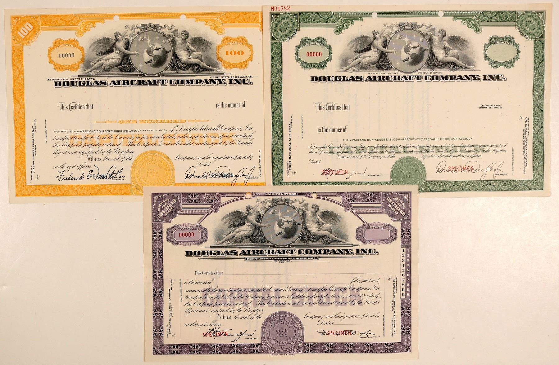 Lot of 3 different. Inc. in Delaware, 1928. All printed by ABN. Purple, green, and orange border with vignette of two angels on either side of Earth with planes flying around it and two other planets. All punch cancelled. The Douglas Aircraft Company was an American aerospace manufacturer based in Southern California, founded in 1921 by Donald Wills Douglas Sr. and later merged with McDonnell Aircraft in 1967. Merged with Boeing in 1997. Douglas was a pioneer in fields such as ejection seats, air-to-air missiles, surface-to-air missiles, and air-to-surface missiles, launch rockets, bombs, and bomb racks. Ken Prag Collection