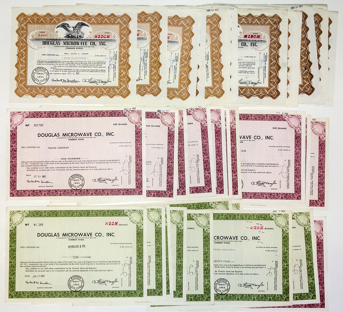 A group of 44 issued certificates from the Douglas Microwave Co. Incorporated in New York in 1952. Certificates issued in 1961 and 1962. Two different formats. First format has an eagle vignette (19 of the certificates). The other 25 certificates have no vignette. The company operated at New Rochelle, New York and was researching microwave products. The certificates all are punch cancelled. VF.