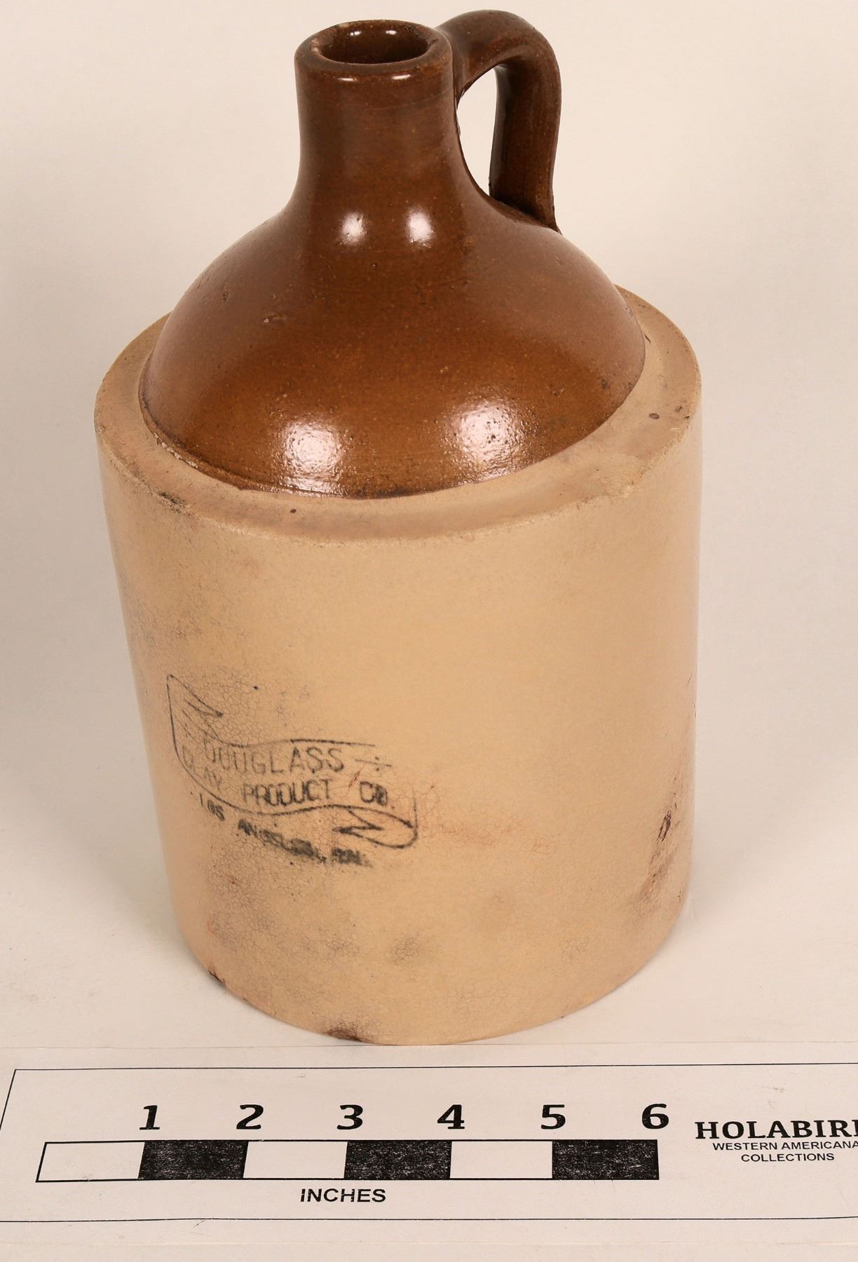 9" tall 6" diameter. Two tone crockery jug, small chip oin shoulder. "Douglass Clay Products Company" in black print within ribbon on the body, with "Los Angeles, Cal" underneath. Scarce jug.