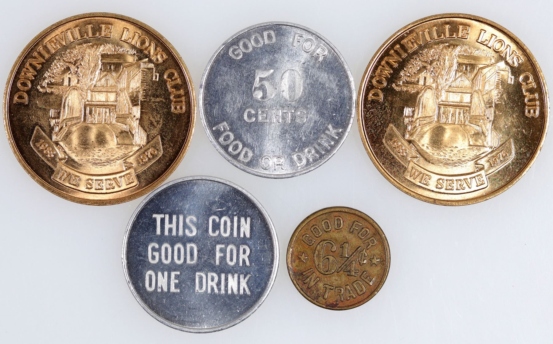 5 Downieville tokens. The Gold Bar, Lions Club 1938-76 x2, Taylor & Gayle. Downieville California