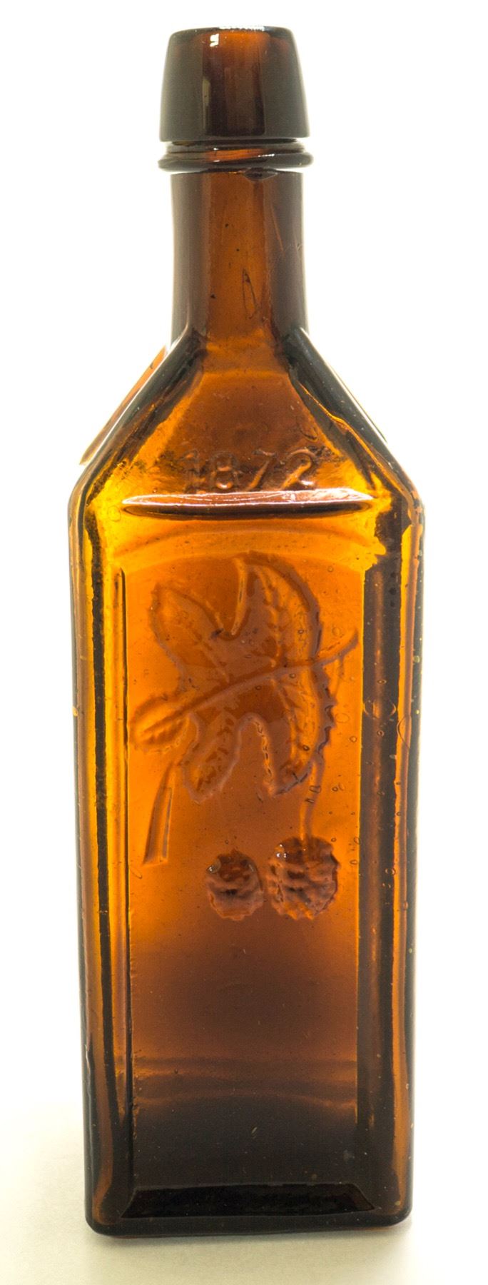 //s// Doyle's //Hop //Bitters//1872// Motif: Hop Flowers n berries, left stem variant.// sp //sp//sp//. Deep honey amber, semi-cabin bitters bottle. 9 1/2" tall, long tapered collar with ring , applied top. Beautiful condition , like a brand new bottle. Never been in the ground. Heavy piece of glass, 2 pounds. ( RH). State: New York City: Rochester Date: 1870's HWAC# 54671