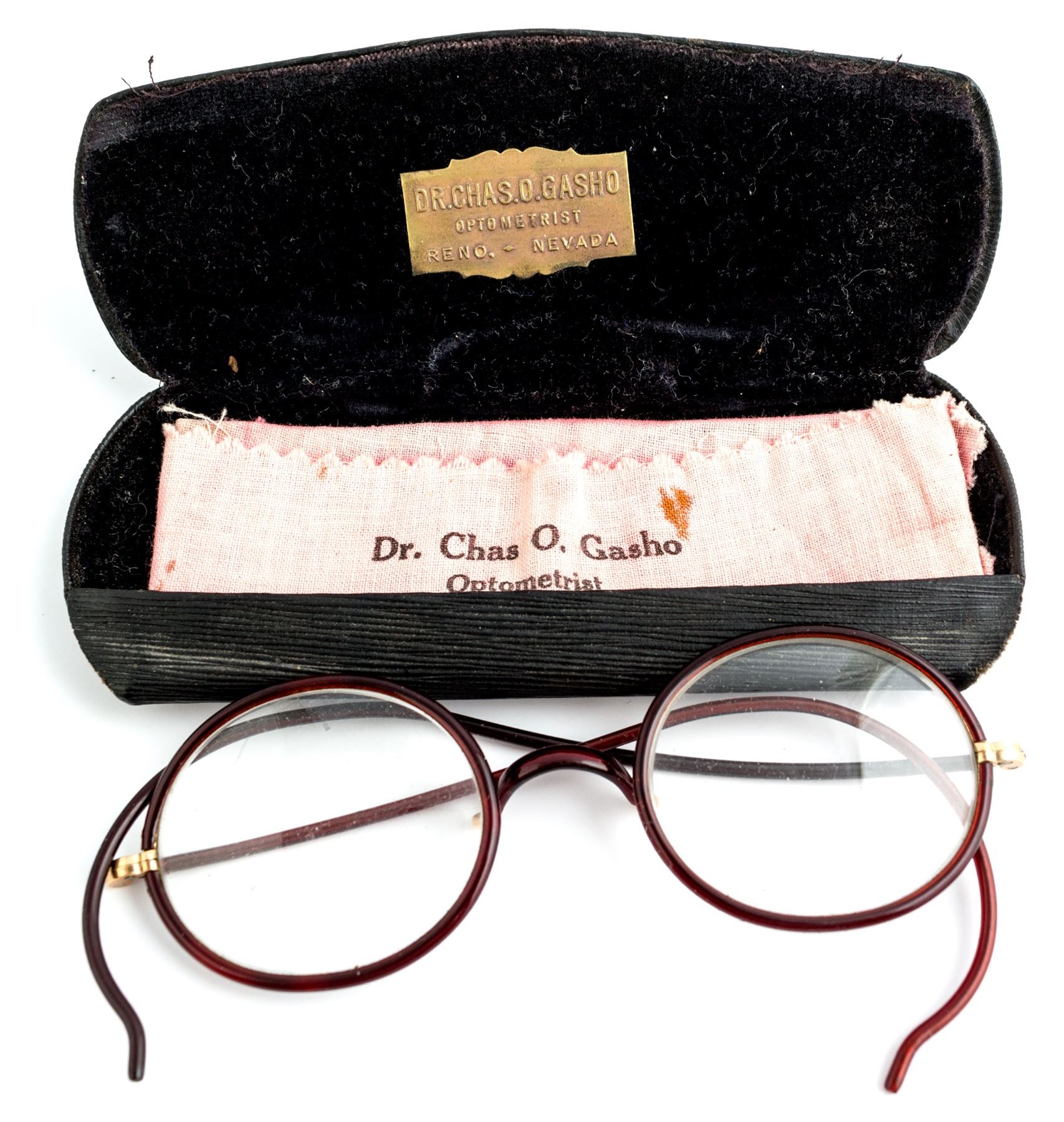 1) Case is in very nice condition. Hard plastic material. Inside in gold color is "Dr. Chas. O. Gasho / Optometrist / Reno - Nevada." 2) Circular glasses of this time period?. 3) Pink cleaning cloth with same advertisement on it. State: Nevada City: Reno HWAC#: 48127 Date: