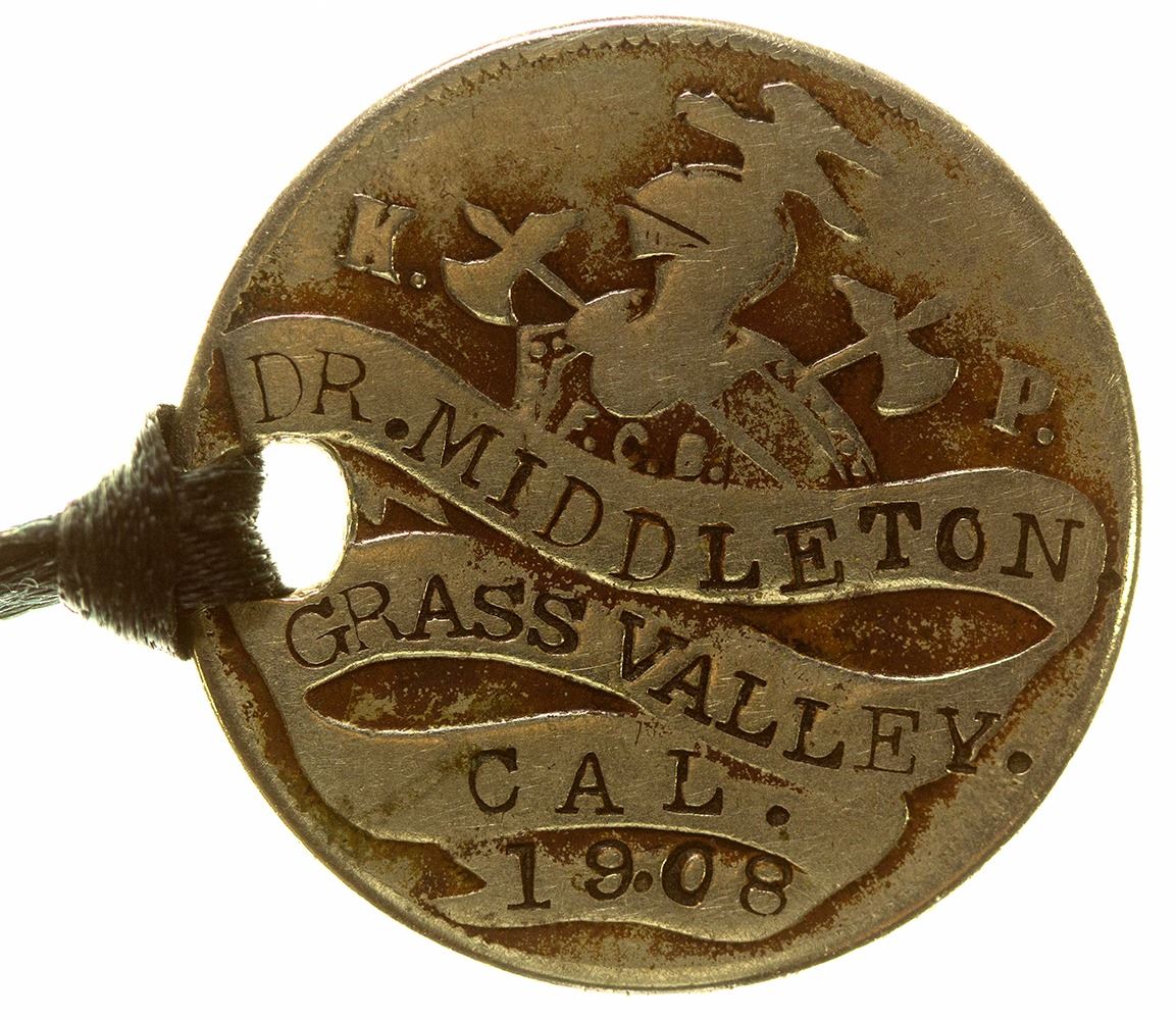 Not listed in the online token catalog. Knights of Pythias token. Has a knight on the top with crossed axes. Pictorial. Initialed FCB. Reverse is plain.27 mm. Worn and with a holed punched for suspension, Still this 1908 token is a nice addition to a collection. State: California City: Grass Valley Date: 1908 FHWAC#: 42671