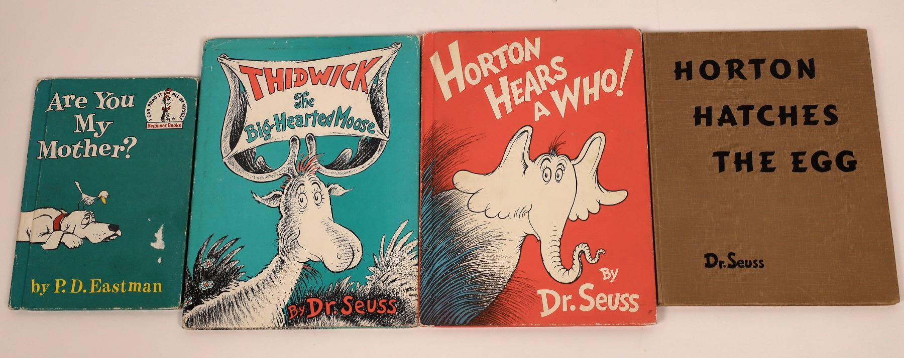 Four books (Three by Dr. Seuss) that are first editions. Horton Hears a Who (1954), Thidwick the Big Hearted Moose (1948), Horton Hatches and Egg (1940) and P.D. Eastman's Are You My Mother (1960). There are some bindery issues with Eastman book and the two Horton books lack dust covers but are in good shape. These are all pretty rare as first editions go because kids usually drew in them or ripped them up. Please see photos for more detail and condition.