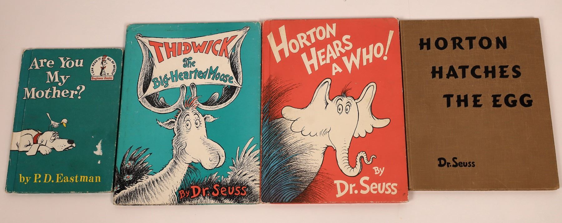 Four books (Three by Dr. Seuss) that are early editions. Horton Hears a Who (1954), Thidwick the Big Hearted Moose (1948), Horton Hatches and Egg (1940) and P.D. Eastman's Are You My Mother (1960). There are some bindery issues with Eastman book and the two Horton books lack dust covers but are in good shape. These are all pretty rare as editions go because kids usually drew in them or ripped them up. Please see photos for more detail and condition.