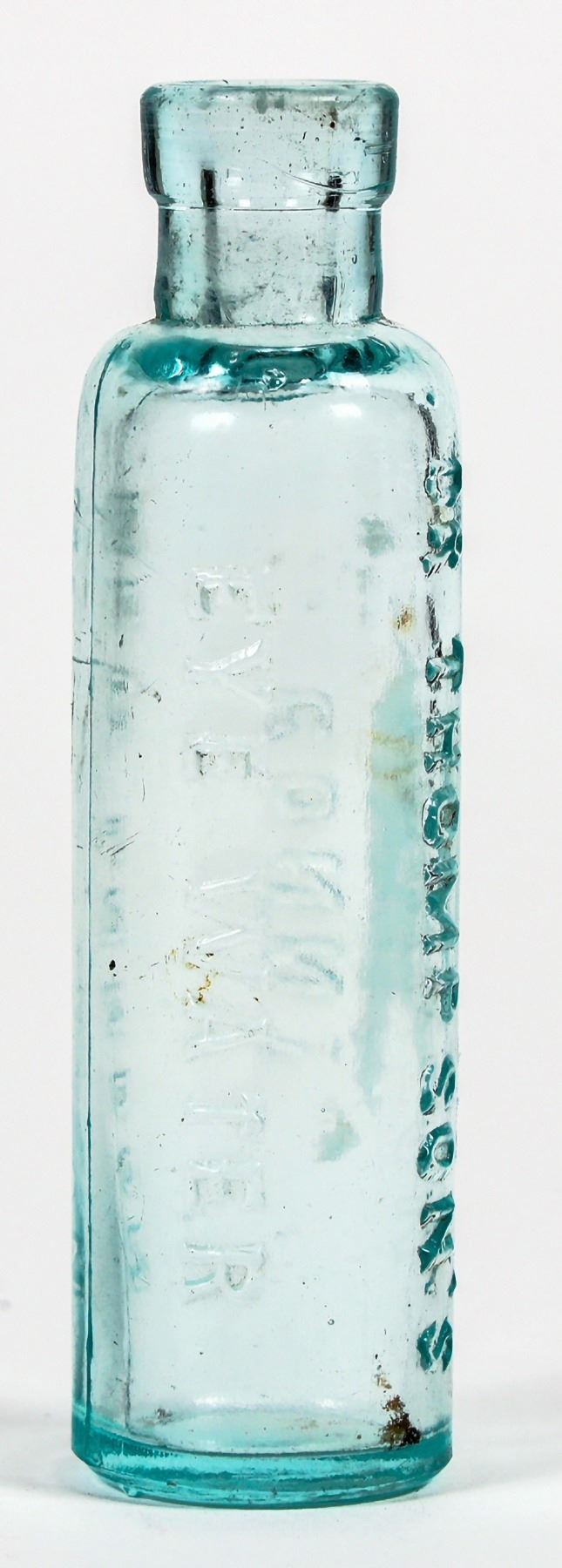 This lot is an aqua bottle with a cylinder shape and "Dr. Thompson's Eye Water, New London, Connecticut." The bottle is BIMAL with no chips, cracks, or major scratches. Dimensions: 3.75 inches tall by 1 inch wide.