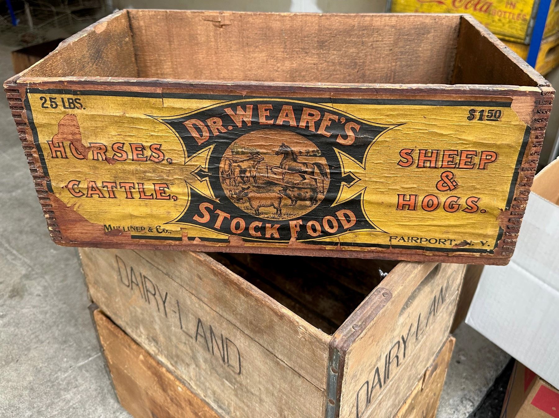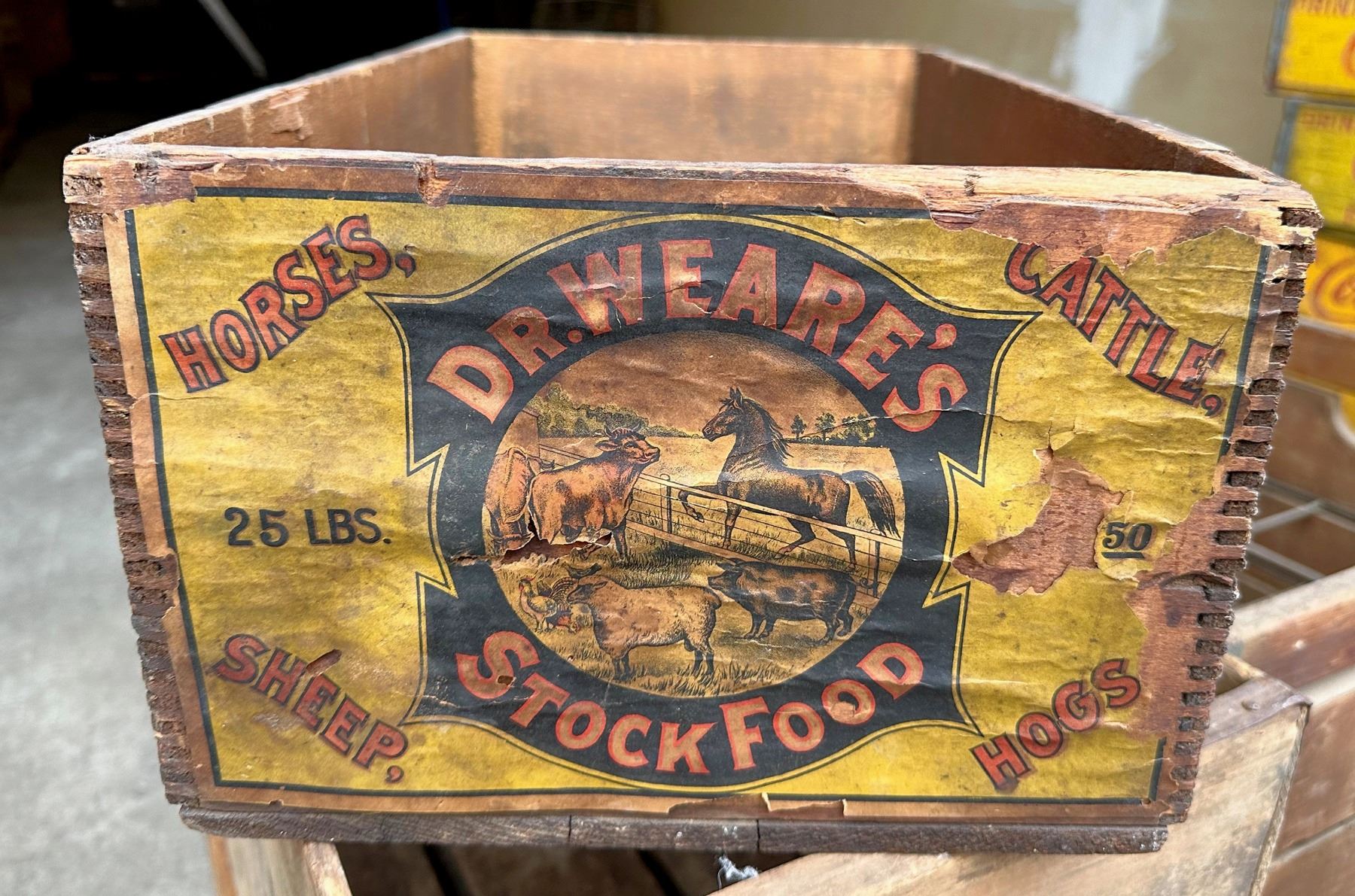 Vintage wood box, c 1890-1915 for Dr Weare's Stock Food, Fairport, NY. 12 x 18 x 8". Bracken Collection New York Fairport