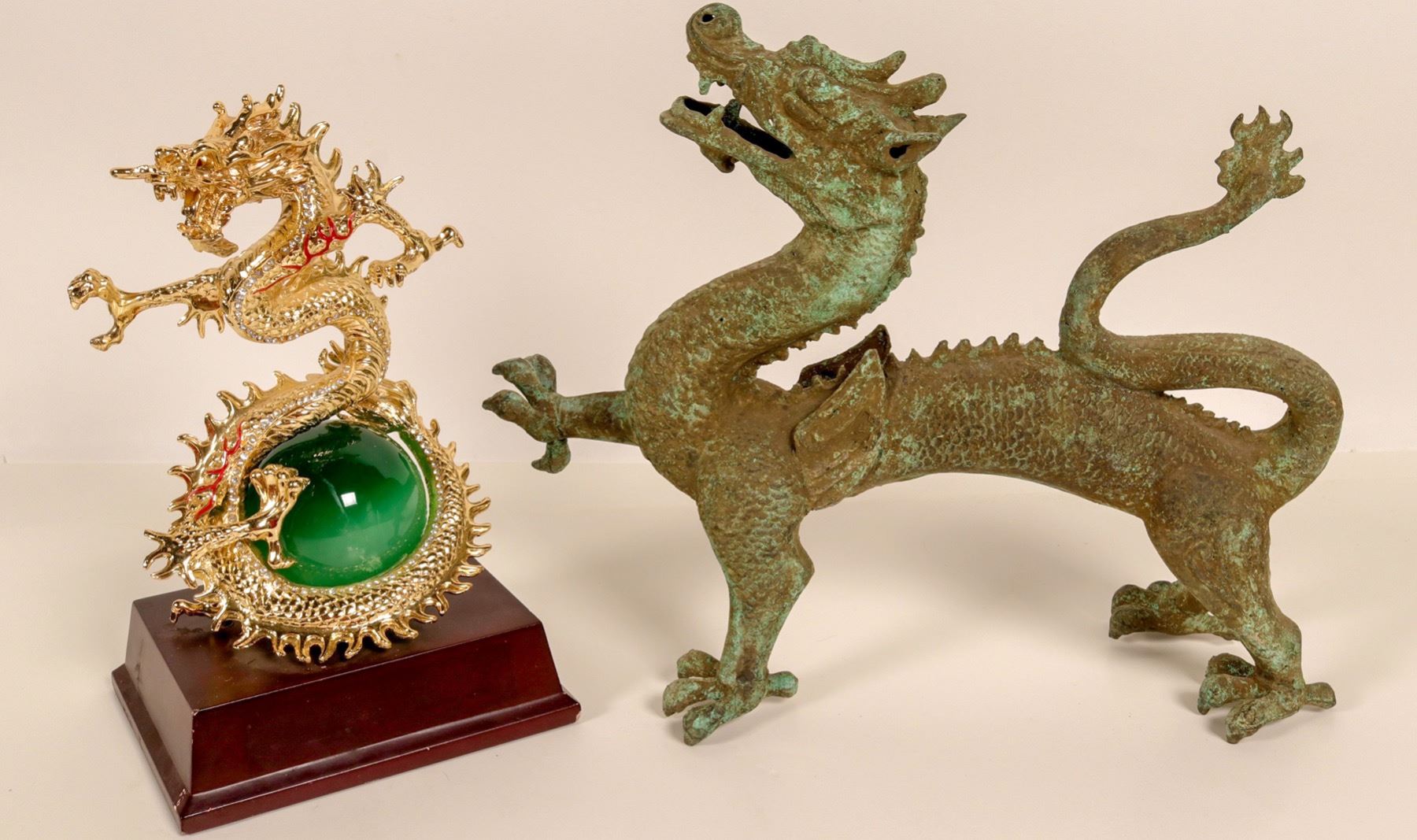 Contemporary Chinese figurines (2). One is green & the other is gold with green glass sphere at center of display. Approx. 14 x 17 x 3 inches; the gold color dragon is approx. 12 x 7.5 inches, the head of this dragon figurine is off of the body. Please inspect. State: City: Date: Provenance: