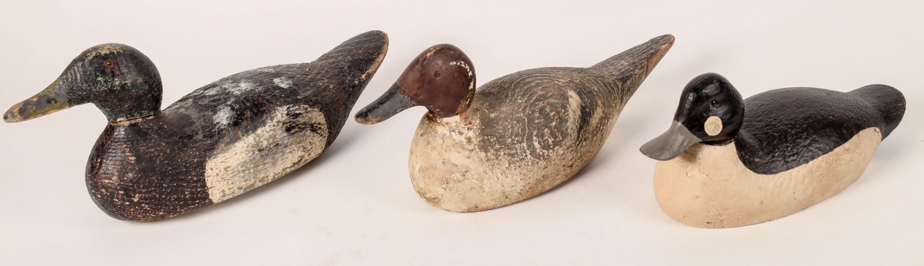3 wood drake duck decoys. Old factory pintail drake, branded S on base, 6.5x15x5", used condition. Greenhead, marked in red paint MC on base, 6.5x15.5x5.25", neck is cracked, used condition. Goldeneye Drake, c. 1940's, Northern Vermont, 5.5x13x5". Gary Bracken Collection