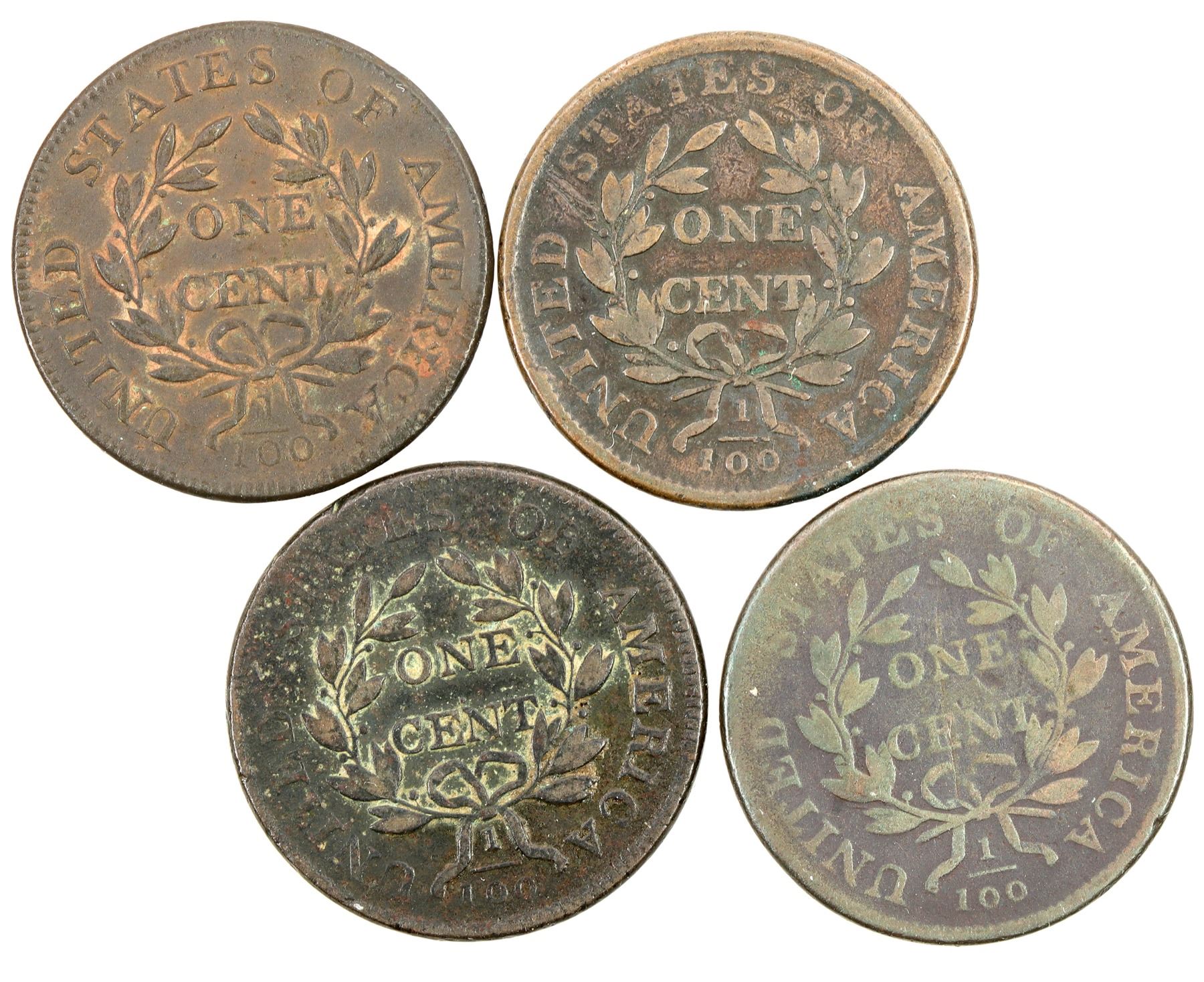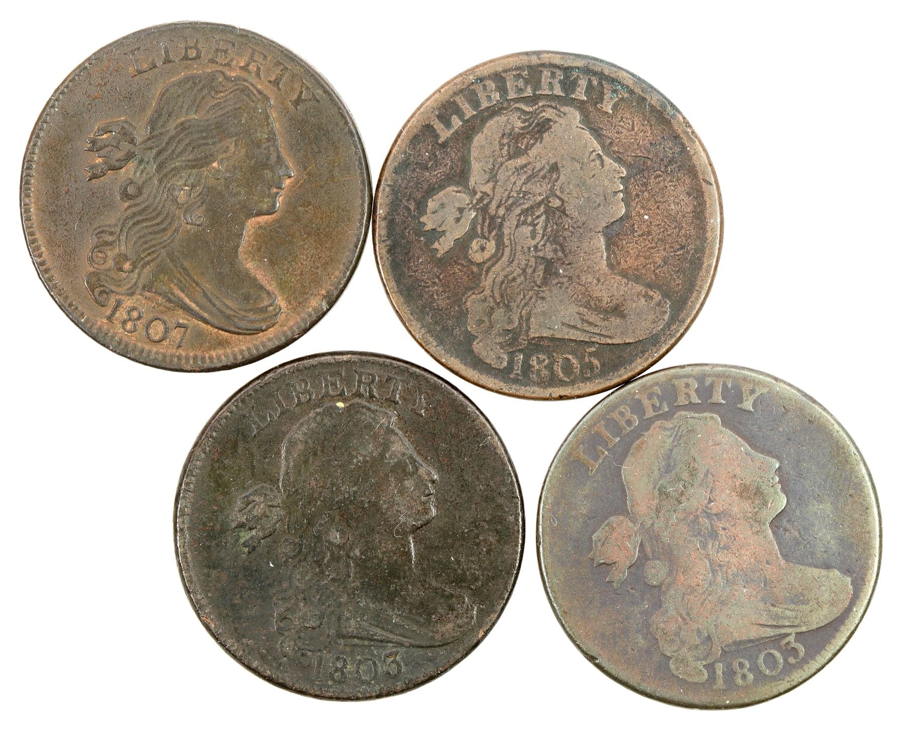 Lot of four Draped Bust cents: 1) 1803, AG-G, polishing at high points; 2) 1803, AG-G 3) 1805, AG-G, scratches; 4) 1807, VG-F.