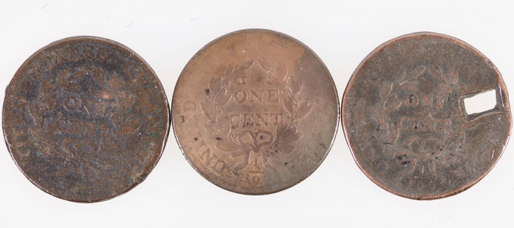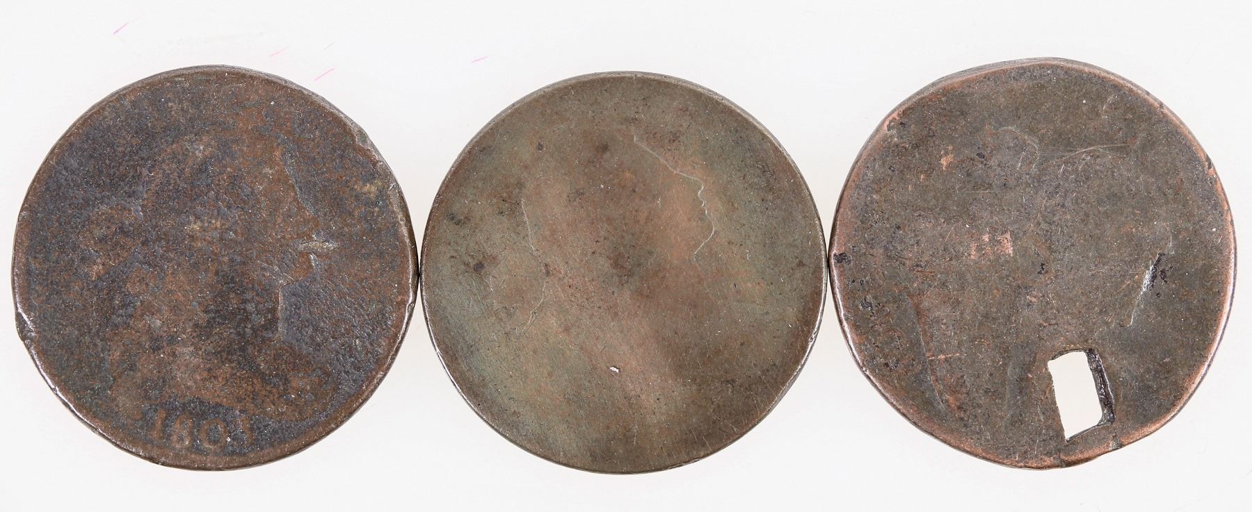 Three well circulated large cents: 1802 (poor, chunk missing); 1803 (AG); 1803 (AG, small date, large fraction).