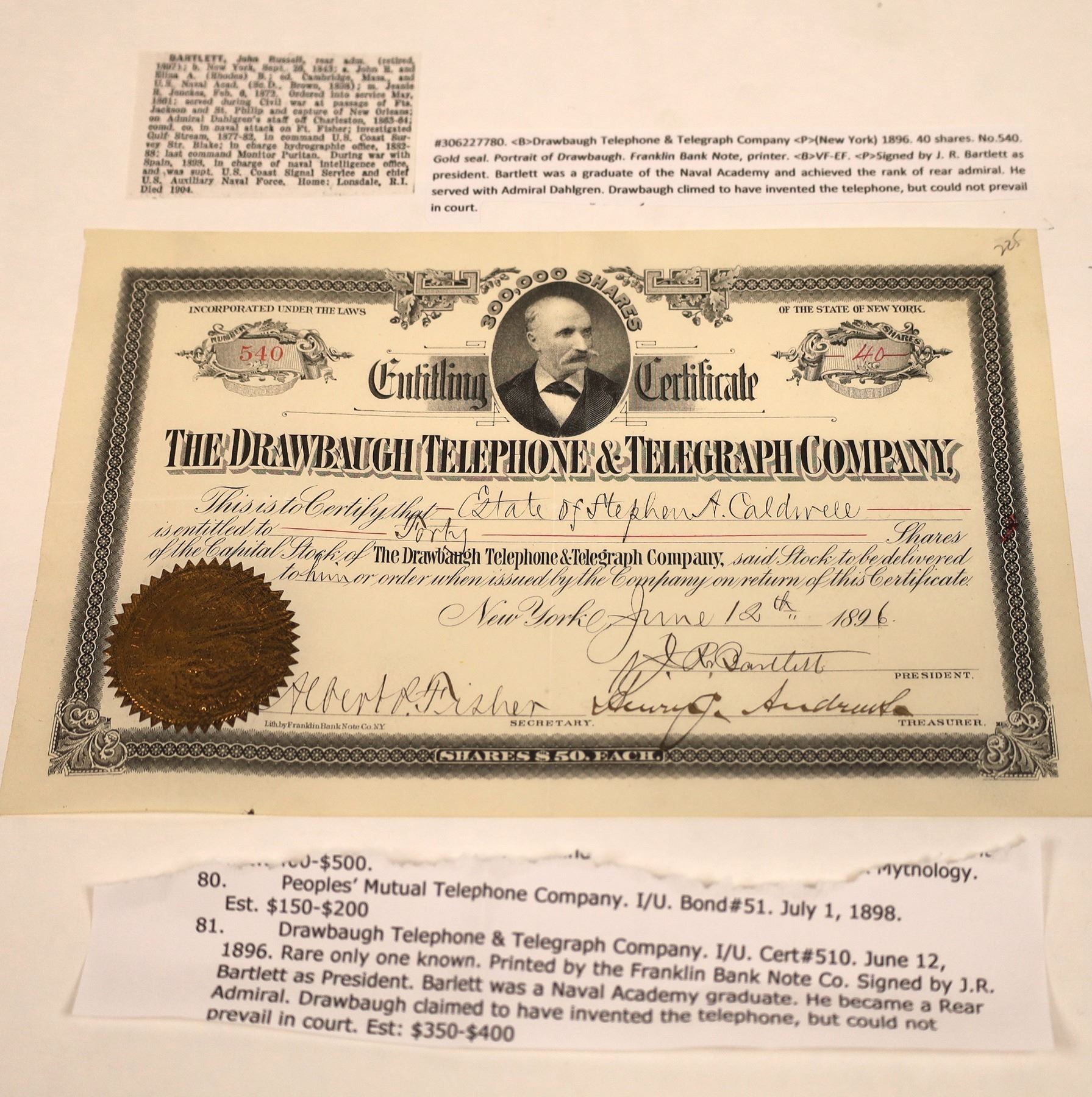 Cert. #540, issued for 40 shares at New York in 1896. Signed by J.R. Bartlett as president. Bartlett was a graduate of the Naval Academy and achieved the rank of Rear Admiral. Vignette is of Drawbaugh. Drawbaugh claimed to have invented the telephone but could not prevail in court. Franklin Bank Note, N.Y. VF. Uncanceled.