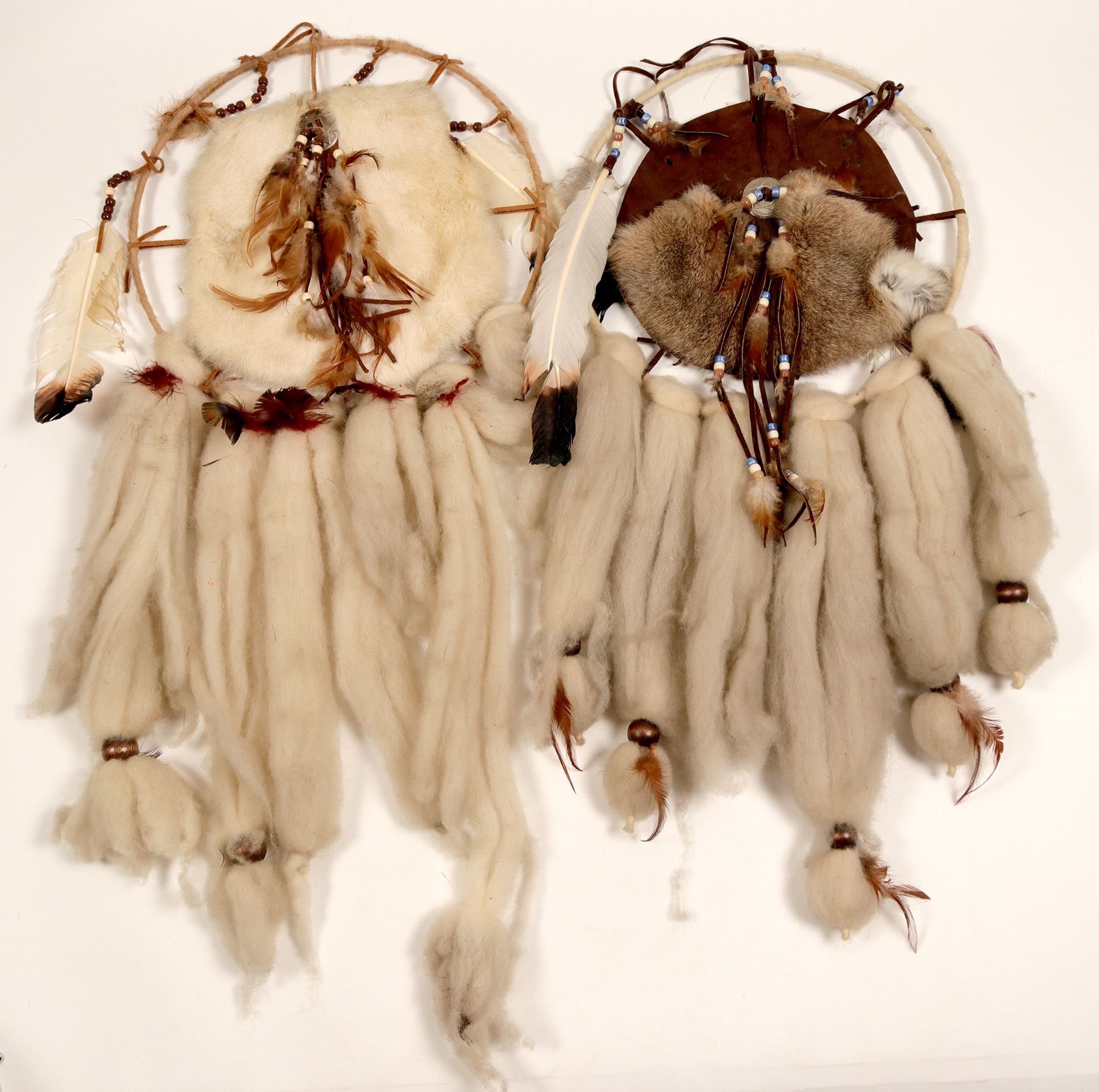 Here are a pair of " Dream Catchers". They are made with rabbit fur, and different types of feathers .Also adornments of white, blue, and rose colored beads with tassels. Simulated tails , with wooden knotting and feathers as well. Really nice looking with, central metal star type ornaments.Would look great on the wall or, over a headboard. (RH).