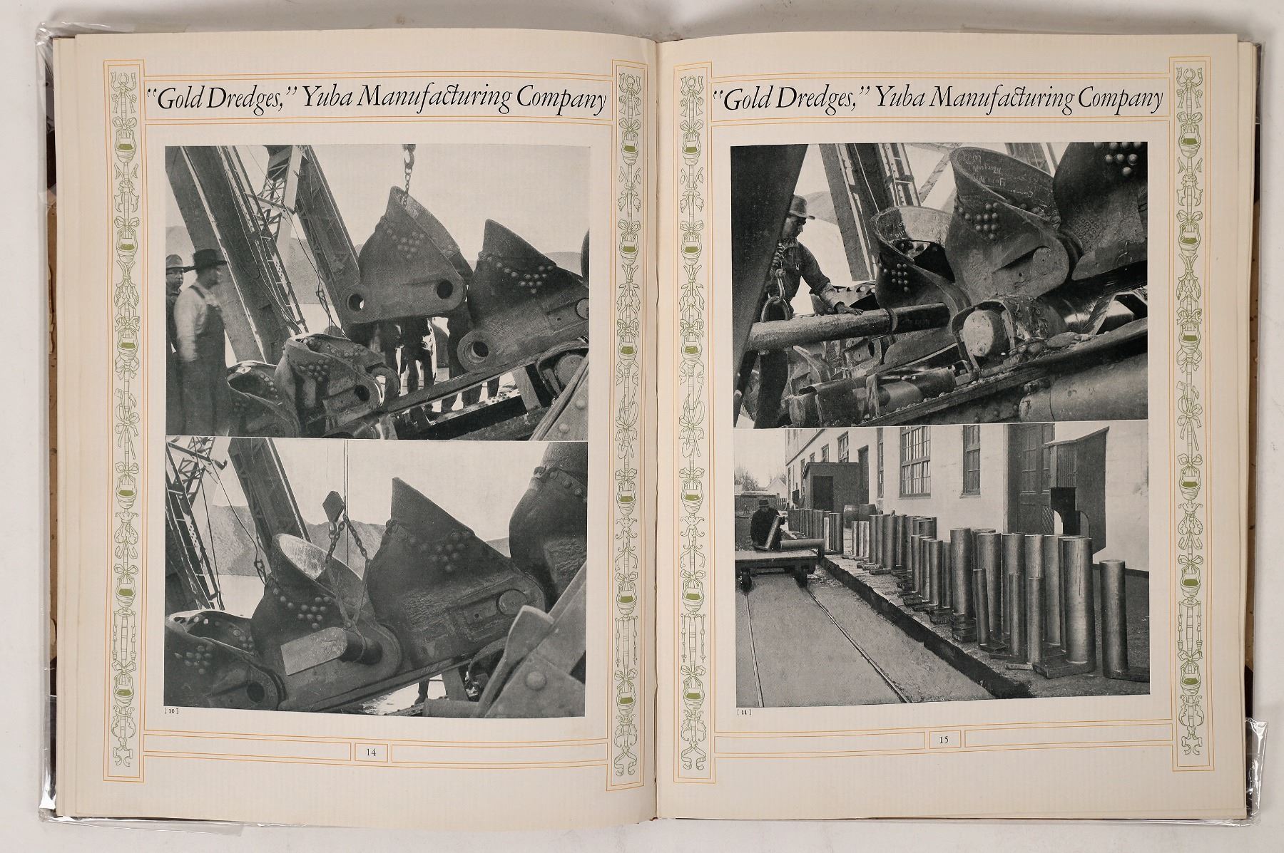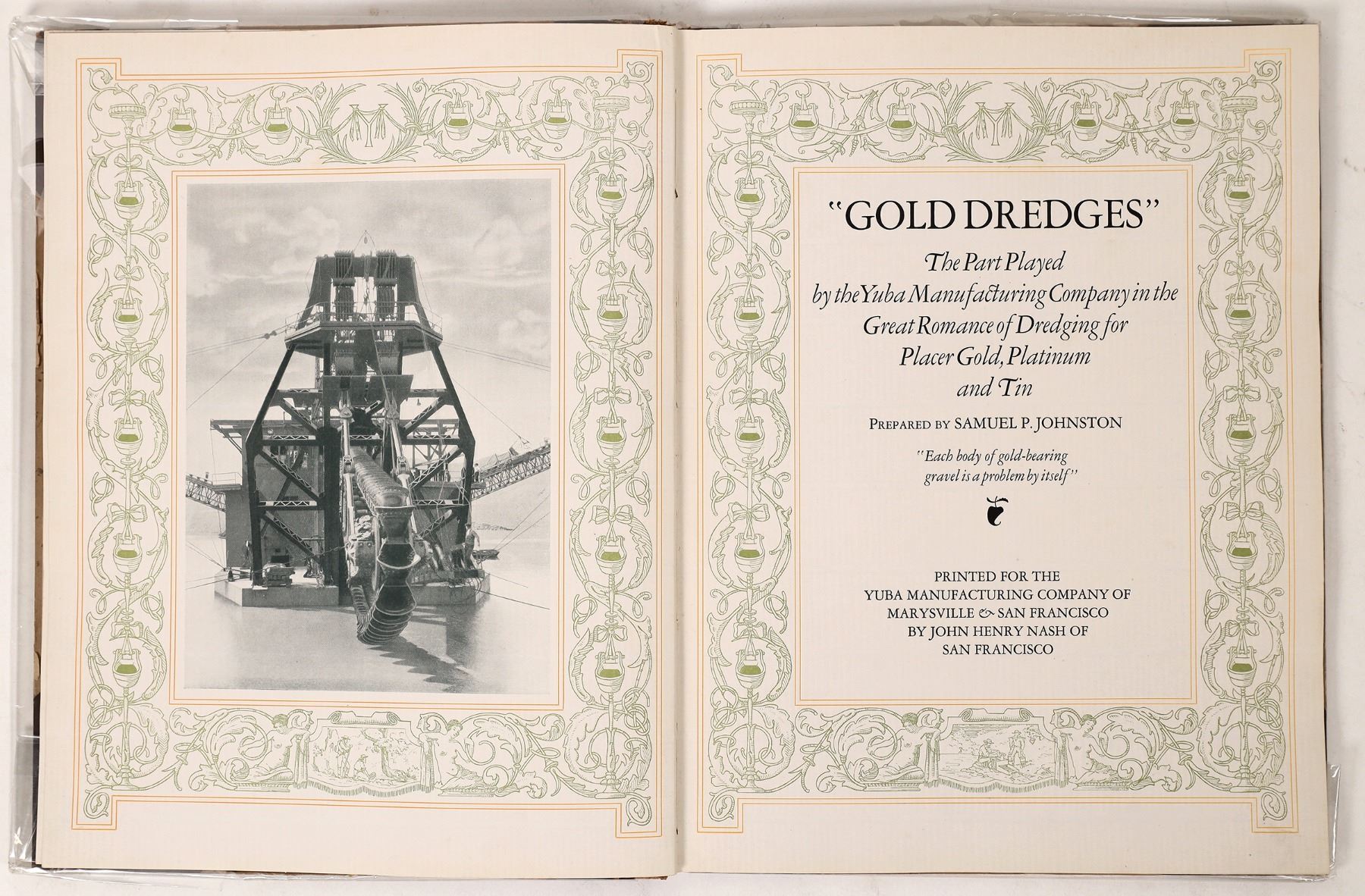 Hardcover Gold Dredges by Yuba Manufacturing, 1927. Lots of dredge and dredge parts photos of the bucket line machine that harvested California gold. 44pp. Plastic cover and some spine wear. California