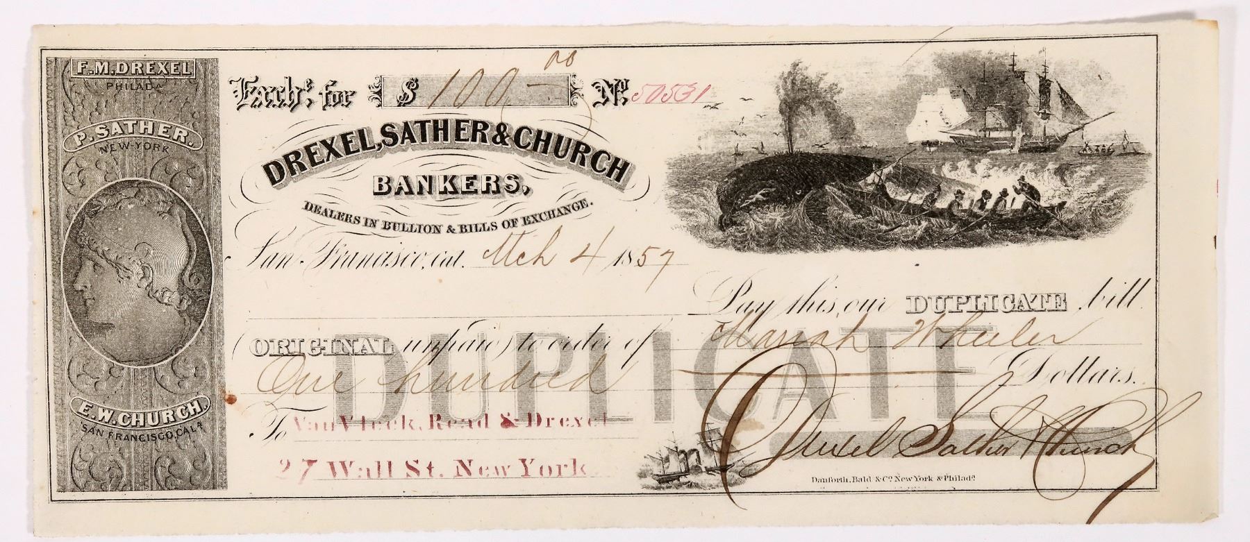 Extremely rare. This features the famous whaling vignette! "Dealers in Bullion & Bills of Exchange." FM Drexel (Philadelphia), P. Sather (New York), and E.W. Church (San Francisco). Dateline San Francisco, March 4th, 1857. Duplicate of Exchange issued to Mariah Wheeler for $100. Signed Drexel Sather & Church. Whaling vignette upper right, smaller paddlewheel steamer vignette bottom center, and allegorical man's head at left. Printed by Danforth, Bald & Co., New York & Philadelphia. 3.5 x 8.5" Clean. They were one of the top exchanges of the California Gold Rush and major shippers of gold to New York. One of the treasure boxes in our S.S. Central America sale belonged to this company. This exchange was issued almost exactly 6 months before the SSCA sank.