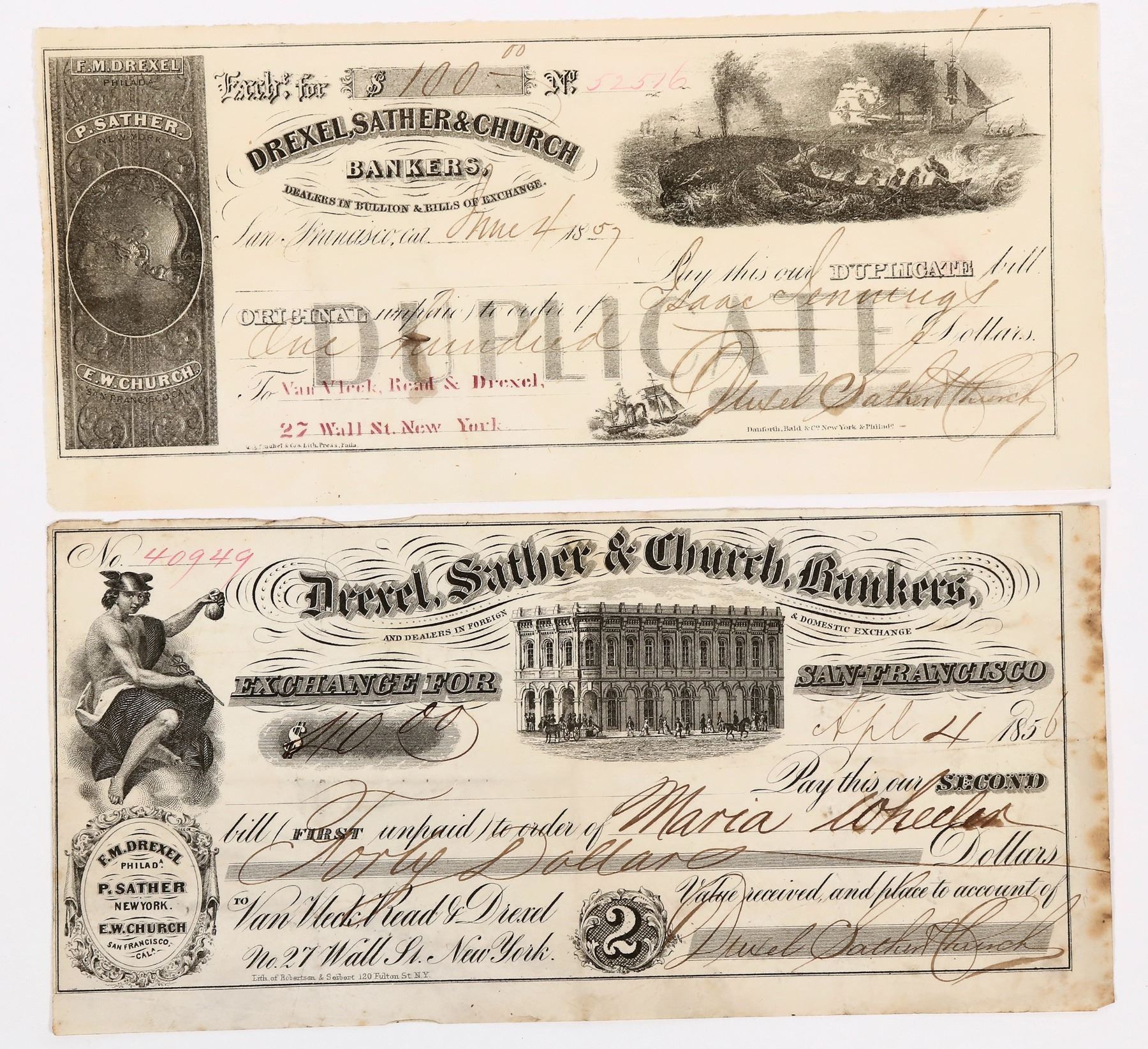 Lot of 2 different. 1) Extremely rare. This features the famous whaling vignette! "Dealers in Bullion & Bills of Exchange." FM Drexel (Philadelphia), P. Sather (New York), and E.W. Church (San Francisco). Dateline San Francisco, June 4th, 1857. Duplicate of Exchange issued to Isaac Jennings for $100. Signed Drexel Sather & Church. Whaling vignette upper right, smaller paddlewheel steamer vignette bottom center, and allegorical man's head at left. Printed by Danforth, Bald & Co., New York & Philadelphia. 3.5 x 8.5" Clean. 2) 1856 Second of Exchange to Maria Wheeler for $40. Vignette of building. Lith. of Robertson & Seibert, NY. 4 x 8.5" Folds, foxing.