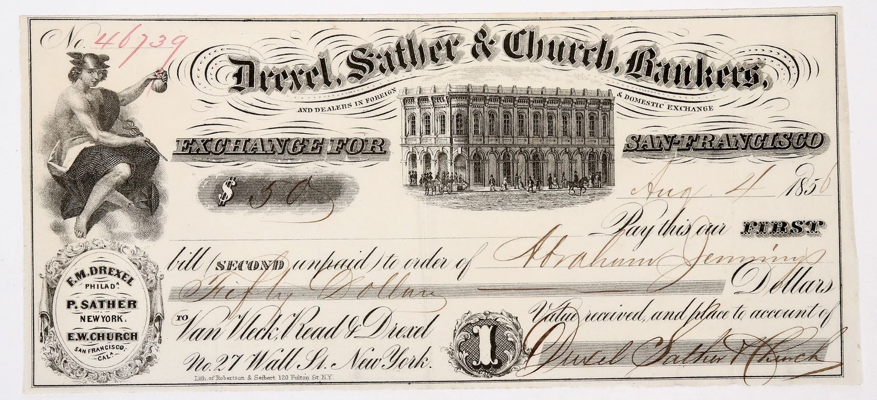 Sather & Church got their start in San Francisco in 1850. Pedar Sather and Edward Church were money brokers in New York. In 1851, they took on a partner, Francis M. Drexel of Philadelphia, founder of the Drexel fortune. Peter (Pedar) Sather and Edward W. Church formed a partnership in New York in the mid-1840s after Church had filed for bankruptcy in March 1842. The partnership was in full swing by 1845, though the pair did not advertise their services. Listed as "brokers" in the various New York City directories, the pair opened a banking office in San Francisco in 1850. By November 1850, the pair had started their regular shipments of gold to New York, where they kept another office open, managed by Peter Sather, who lived across the harbor in Brooklyn. Sather closed the New York office about 1854. In May of 1851 the partners greatly strengthened their firm by adding the partnership of Francis Drexel, a prominent Philadelphia banker who clearly was trying to get his fingers into the California gold business. Together the three partners quickly built a huge and profitable firm. Drexel, Sather & Church became one of the largest gold shippers during the golden years of the California Gold Rush, the 1850s. Drexel had founded Drexel & Co. in Philadelphia in 1837. While he died in 1863, Drexel's firm continued to grow, becoming one of the largest investment banking firms in the world.