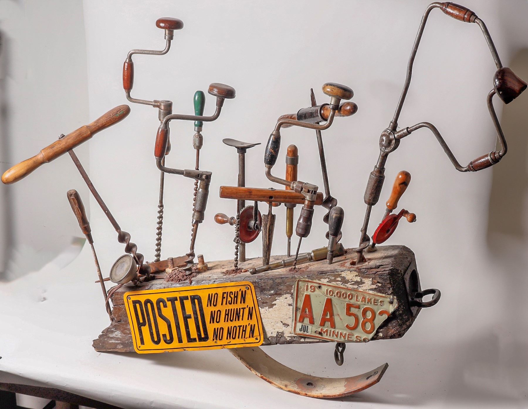 Absolutely classic folk art hardware sculpture composed of 14 antique drills set in an antique 8x8 timber. The front features a tin sign reading 'POSTED: NO FISH'N, NO HUNT'N, NO NOTH'N' as well as a vintage Minnesota license plate. This phenomenal piece of classic Americana would be a perfect fit for the display window of any hardware store or the home of any folk art enthusiast. Make sure to check out the photos of this one -- words don't do it justice!