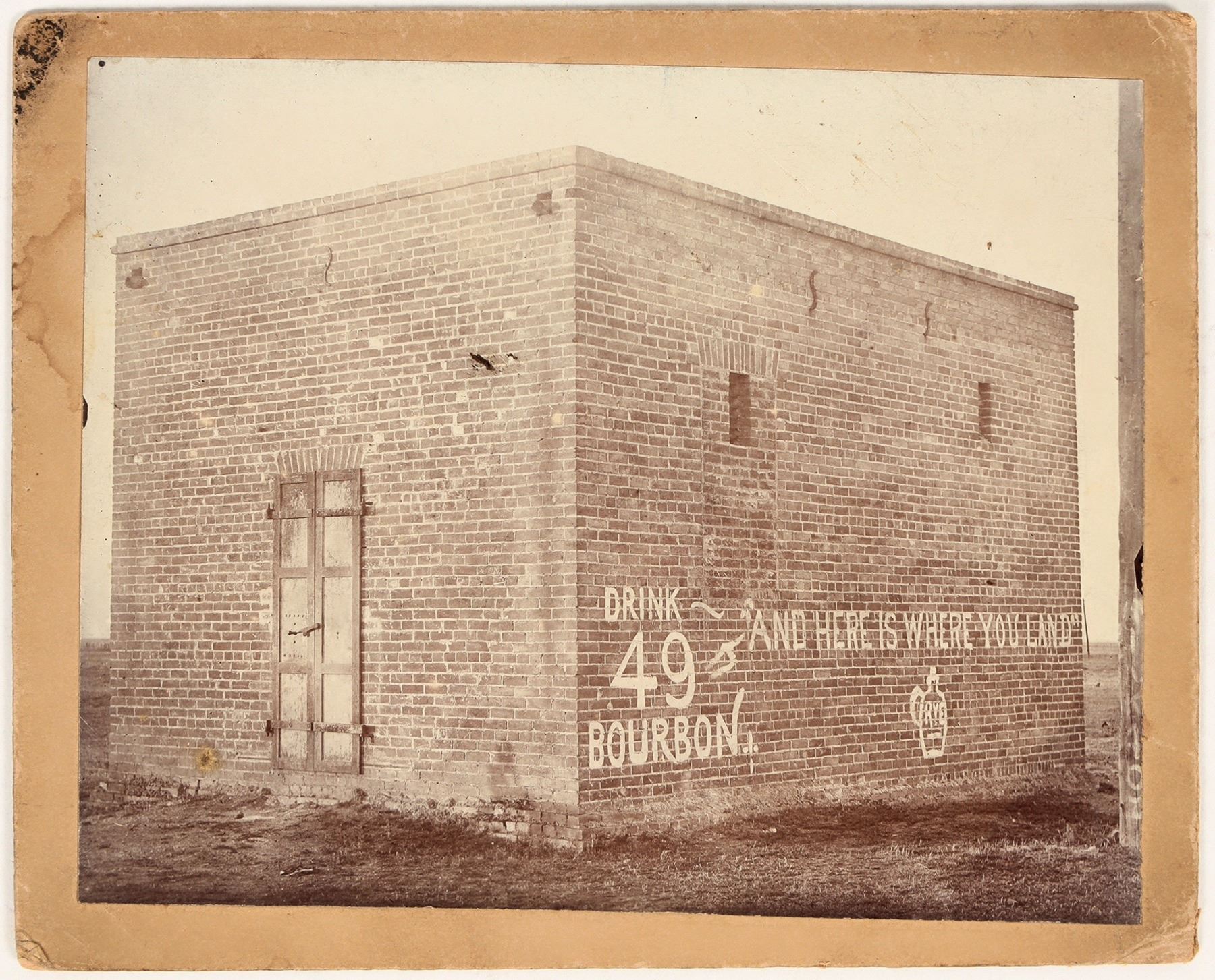 Photograph of the Williams, Colusa County California jail and painted on the wall: "Drink 49 Bourbon and Here Is Where You Land". Dated 1898 on reverse; photo is 5 1/2 x 4 1/2 inches.