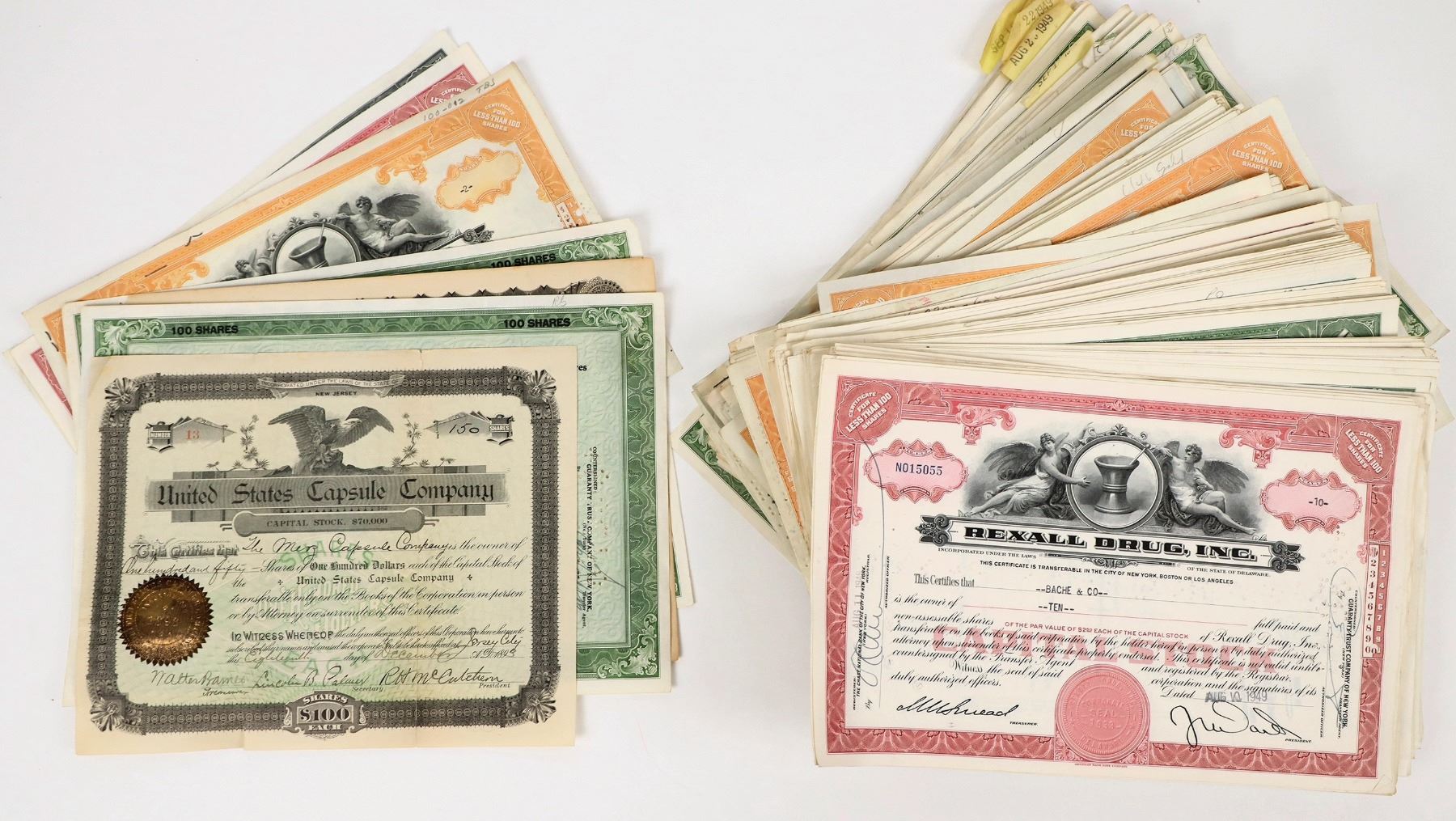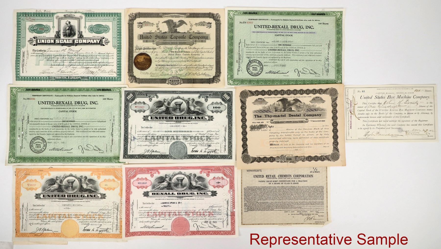 These are drug company stock certificates 1940s: Rexall Drug Inc.; United Drug Inc.; United-Rexall Drug Inc. The Thy-ma-tol Dental Company stock certificates 1915. Please see photo for details.