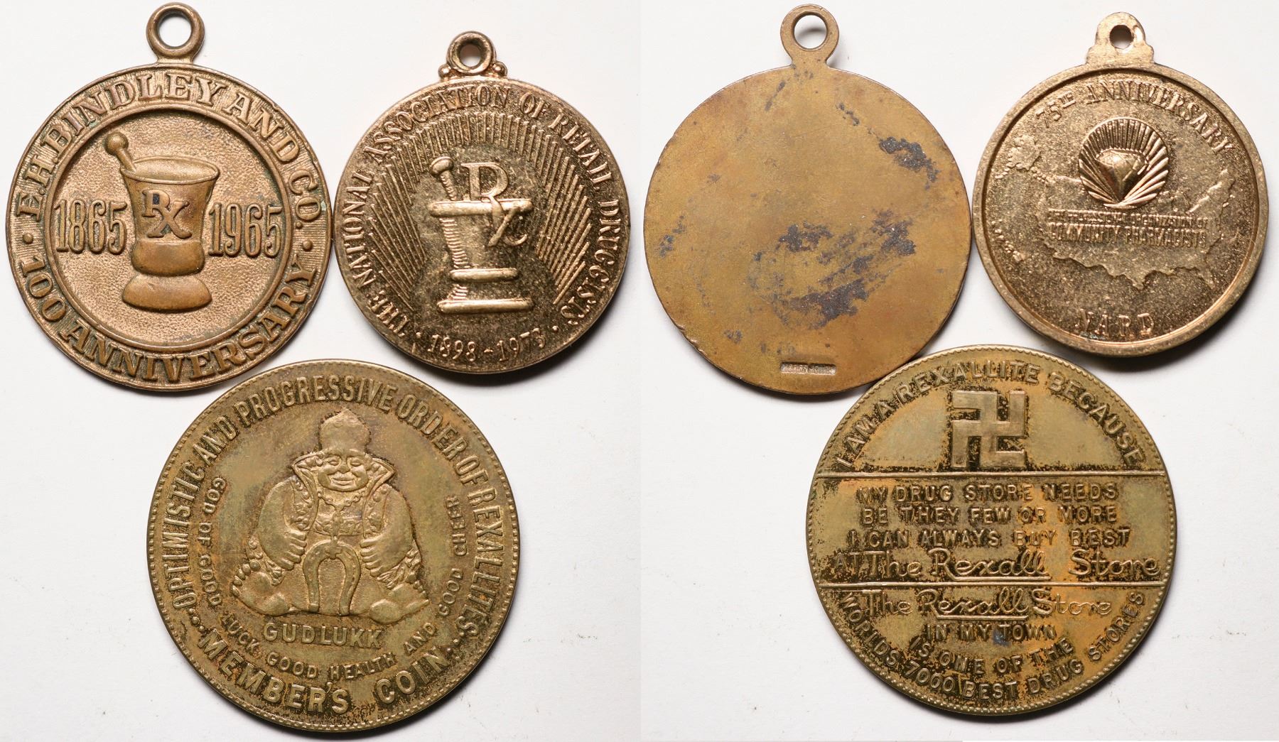 Third is from Boston Mass. 30mm OPTIMISTIC AND PROGRESSIVE ORDER OF REXALITES / (statue) / GUDLUKK / GOD OF GOOD LUCK, GOOD HEALTH AND GOOD CHEER / MEMBER'S COIN I AM A REXALITE BECAUSE / (swastica) / MY DRUG STORE NEEDS / BE THEY FEW OR MORE / I CAN ALWAYS BUY BEST / AT THE REXALL STORE / THE REXALL STORE / IN MY TOWN / IS ONE OF THE / WORLDS 7000 BEST DRUG STORES (gilt brass)