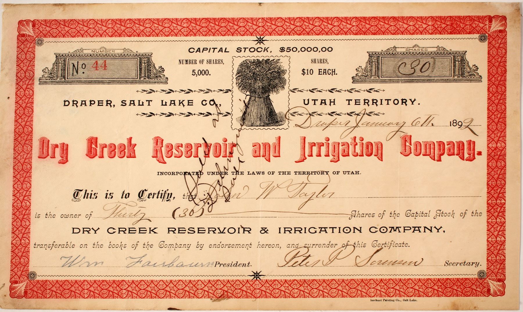 # 44 for 30 shares to John W Taylor. Signed by William Fairbaum and Peter P Sorensen. Dateline Draper (rare) 1892. Located in Draper, Salt Lake County. Wheat vignette. Merchant Printing, Salt Lake. Not cancelled. Issues, though small, throughout border. Nice! Draper City is nestled in the far southeast corner of the Salt Lake Valley, with the Wasatch Mountain Range on the East and the Traverse Ridge Mountain on the south. Draper lies roughly midway between Salt Lake City and Provo. Dry Creek Reservoir still exists today, though a new dam is being considered. It is in the Upper San Joaquin RIver Basin on Dry Creek which is a tributary of Kaweah River. At the conference at Aalborg, 1902, Elder Peter Sorensen was appointed to Thisted. John W. Taylor. John Whitaker Taylor was a member of the Quorum of the Twelve Apostles of The Church of Jesus Christ of Latter-day Saints and was the son of John Taylor, the third president of the church. While he was an apostle, Taylor was excommunicated from the LDS Church for opposing the church's abandonment of plural marriage. Taylor was a staunch believer in the doctrine of plural marriage, and had six wives and 36 children. Although the church officially forbade the practice with the 1890 Manifesto. [wikipedia] Prag Collection