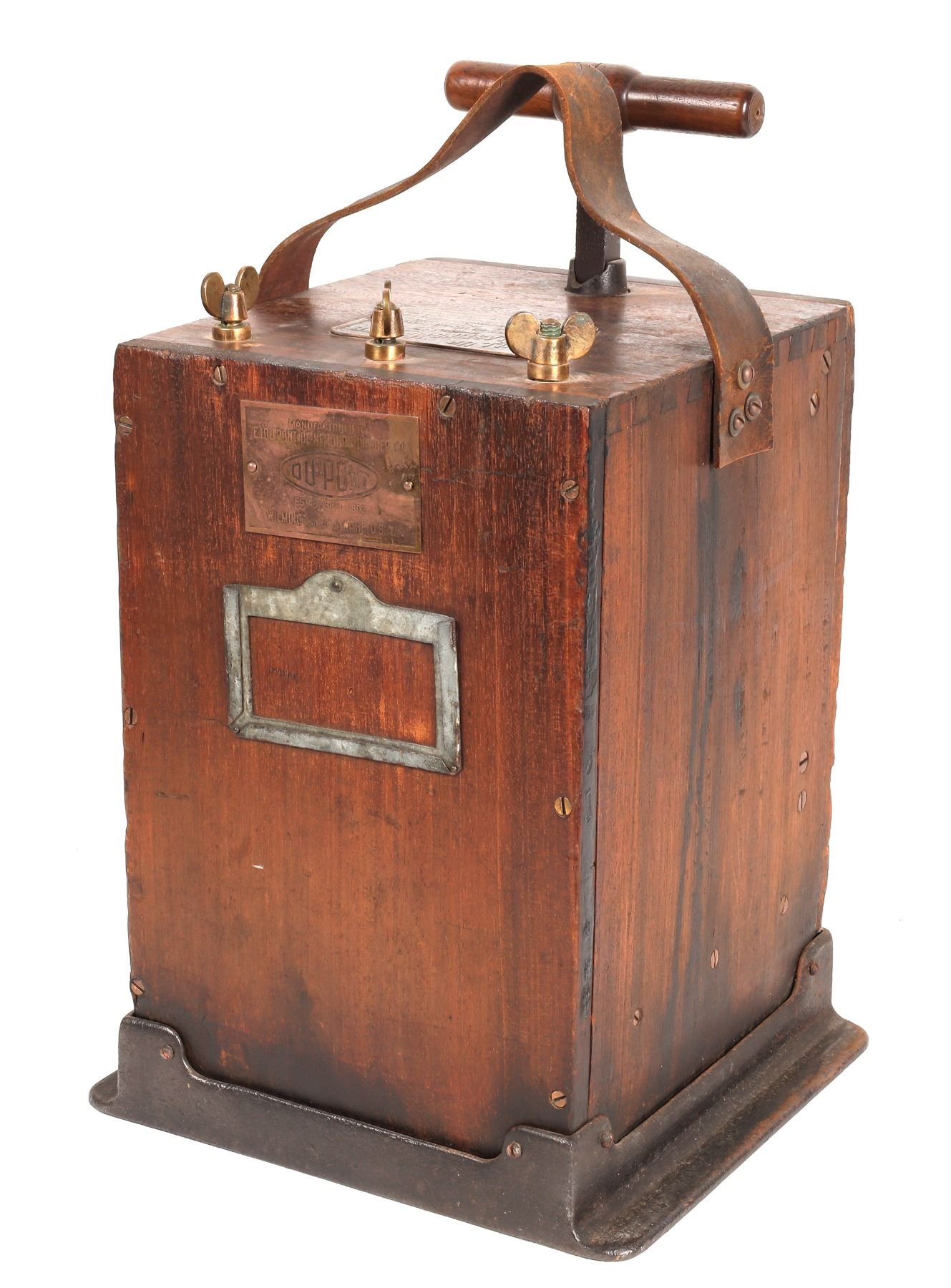 DuPont No. 4 Pull Up blasting machine. Plunger mechanism moves with resistance, may need lubrication. Chip to metal around plunger base. Cast iron base. 2 original brass plaques. No original paper. "Will blast 40 to 50 holes". 18x9x10.5". About 21 lbs.