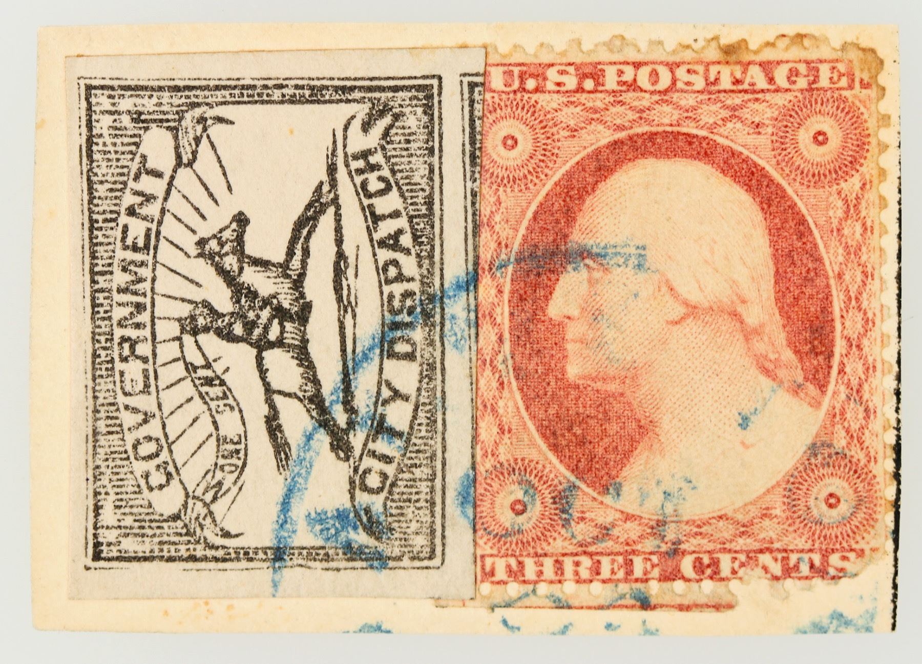 Dual Use Scott #26 & ILB8 stamps. Blue "Oct" cancelation mark ties both stamp to cover. Black and white stamp overlaps the left edge of the red 3c stamp. See photo.
