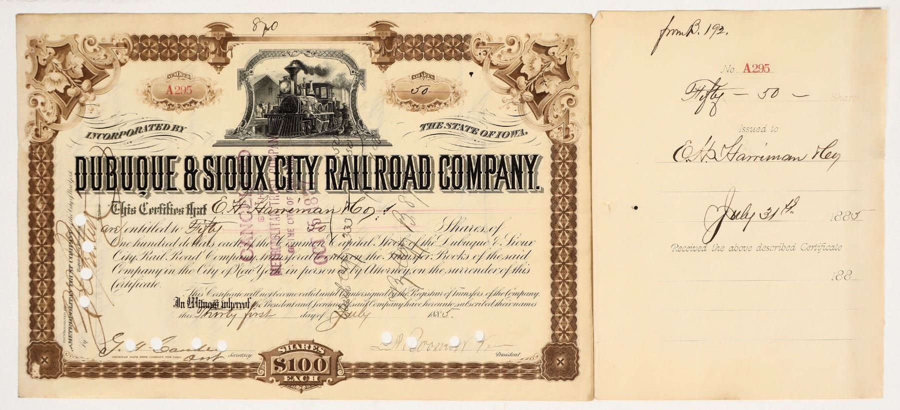 I/C, Dubuque % Sioux City Railroad Co. Stock issued July 1885, signed by James Roosevelt president. Uncle of President Teddy Roosevelt. Vignette 4-4-0 locomotive at depot. American BNC printer. Roosevelt bio included.