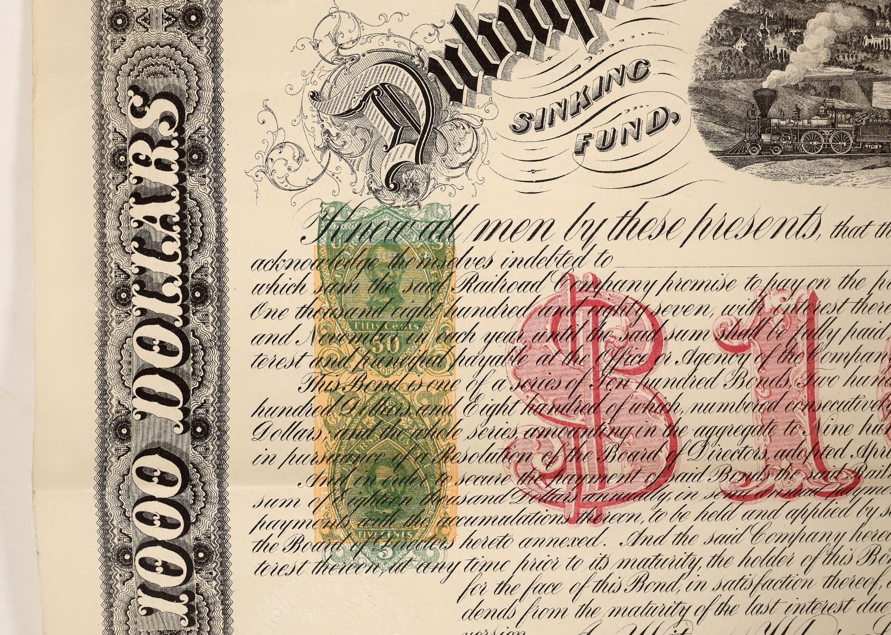 Issued 1867 Dubuque and Silver City Railroad bond with rare and unusual imprinted RN's! Original imprint is W2 with overprinted V1 and P1. See Castenholtz info listed under RN-V1.