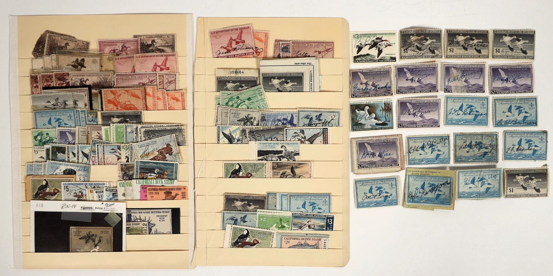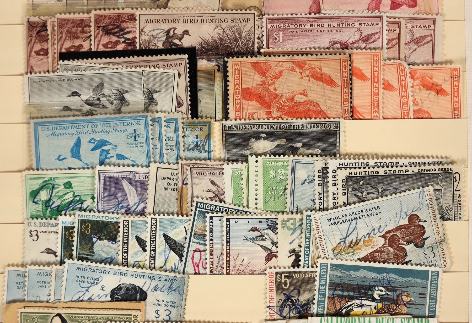 Duck stamp collection. About 100 gorgeous stamps with pictorial ducks. Several stamps are duplicates. Monochrome designs and multicolor stamps. Perforations are generally intact, most are reasonably well centered. Longest stamp ~2". See photo.