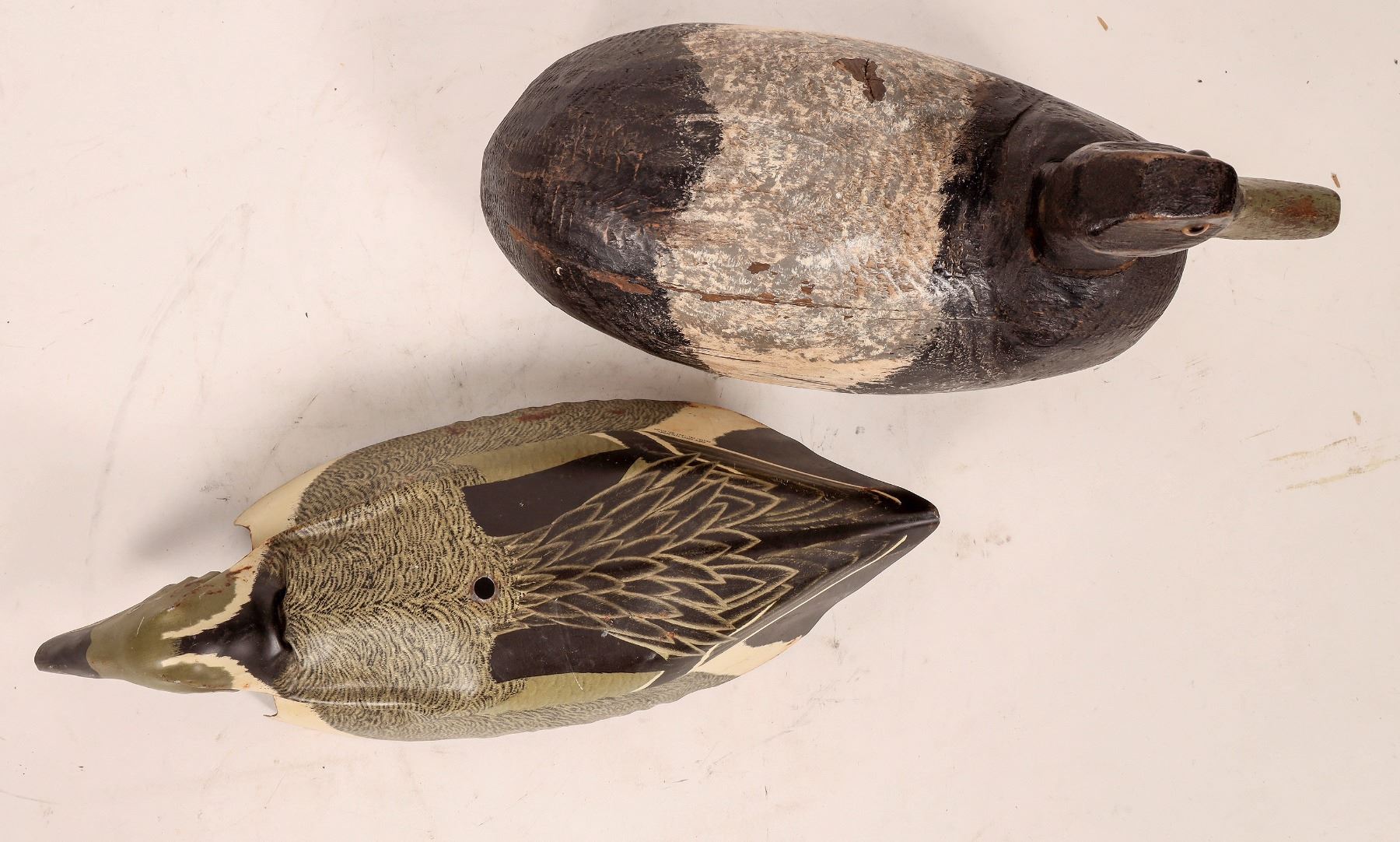 3 unmarked wood black and white duck decoys. 2 are about 12", 1 has a neck crack. Another is 14" with a full length crack and paint loss. All appear to have been floated. Lastly there is an unusual pressed metal decoy with wood base, greenish duck, 16".