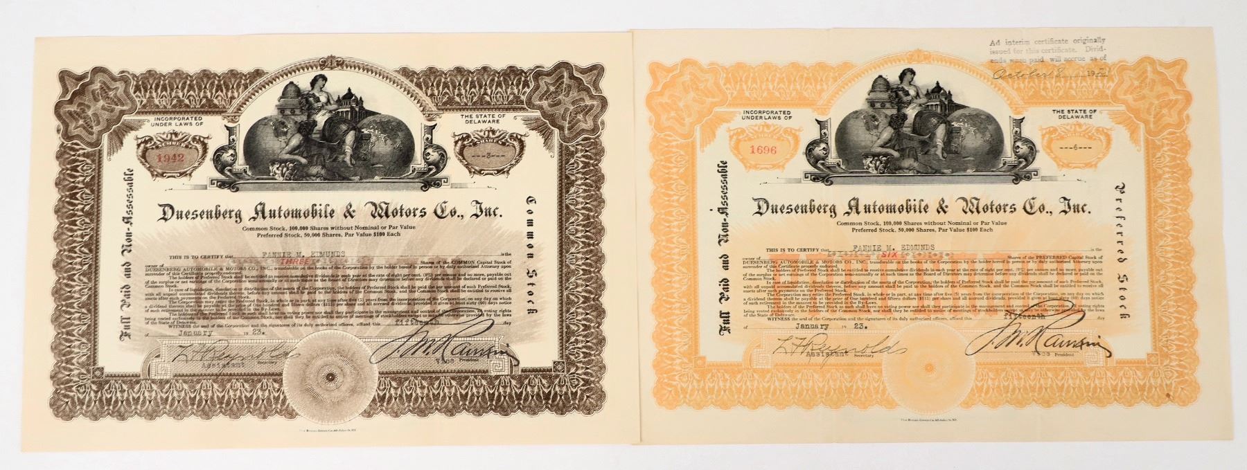 Lot of two different stocks both issued in 1923. Not cancelled. Orange or brown borders, allegorical vignette. Duesenberg Automobile & Motors Company, founded in 1913 by brothers Fred and August Duesenberg, became renowned for engineering some of the most advanced and luxurious American cars of the early 20th century. The company gained fame for its high-performance engines, racing victories‚-including Indianapolis 500 wins‚-and later for the opulent Model J, introduced under new owner E.L. Cord in 1928. Despite its engineering brilliance, the Great Depression devastated sales, and the company ceased production by 1937, leaving behind a legendary legacy of speed and luxury.