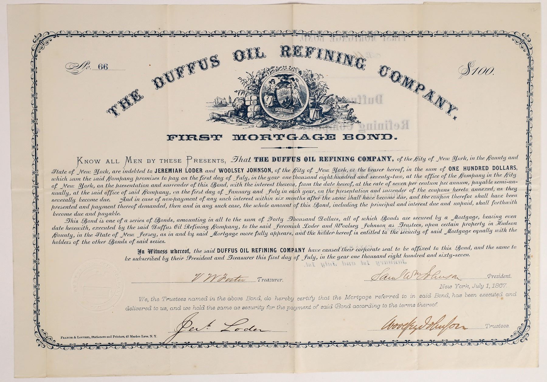 $100 First Mortgage Bond. No. 66, issued to Jeremiah Loder and Woolsey Johnson of New York in July 1867. Signed by president Samuel Shusa, treasurer VW Foster, as well as trustees Loder and Johnson. Blue border and print with allegorical vignette. Printed by Francis & Loutrri, NY. 10.25 x 14" Nine coupons attached. Folds. Text on bond states the property is in Hudson County, New Jersey. No other information located on newspapers.com.