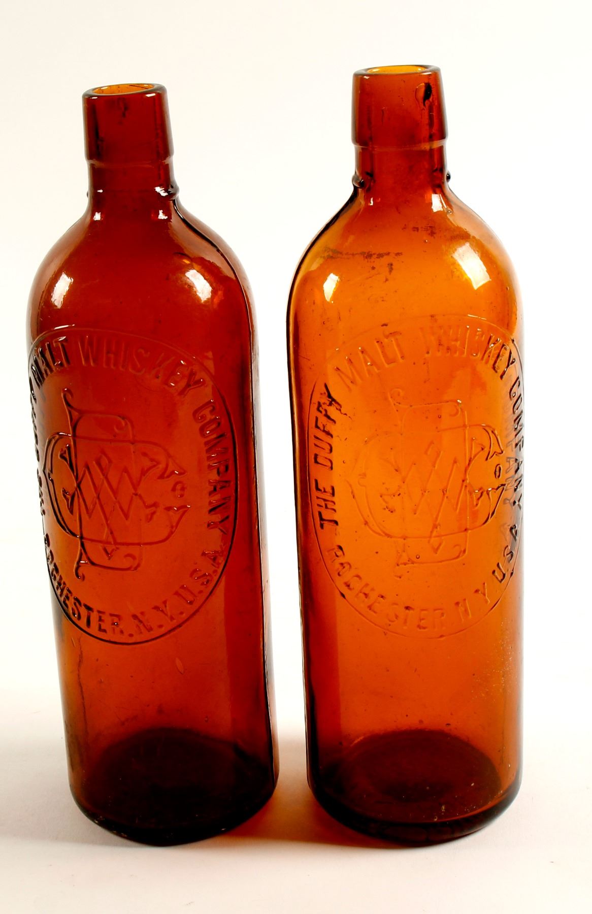 Item # 1 of 2: Duffy's Malt Whiskey Company ( au ) // Monogram: Elaborate, interlocking lettering ( D.M.W. Co , beautiful & bold ) / Rochester , N.Y. U.S.A. ( ad )// Base embossed : Patd Aug 24 ( au) / # 17/ 1886 ( ad ) // Light yellowish orange amber, round whiskey bottle. 10 1/4" tall, long straight collar, tolled top. Good condition, but there is a little light overall scratching. No major damage. Item # 2 of 2: Embossed the Same as Item #1, except a different color. Exceptionally light golden yellow colorization.But there is a 1/4" flash in lip. Otherwise pretty nice. Nice pair of Duffy's, for your window sill corners !! ( RH )