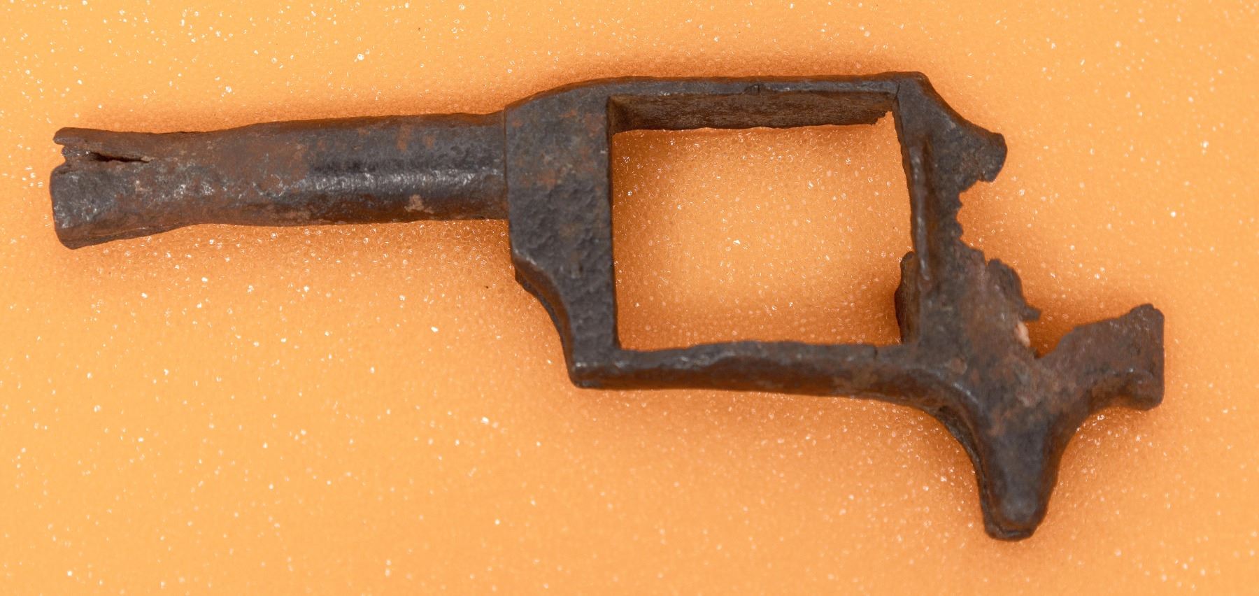 This small frame pistol was dug up near Grant, Nebraska on the Texas Trail. The frame has no identity and the barrel is burst near the muzzle. Clearly there was an obstruction to the barrel before firing. A spur trigger model of unknown origin.