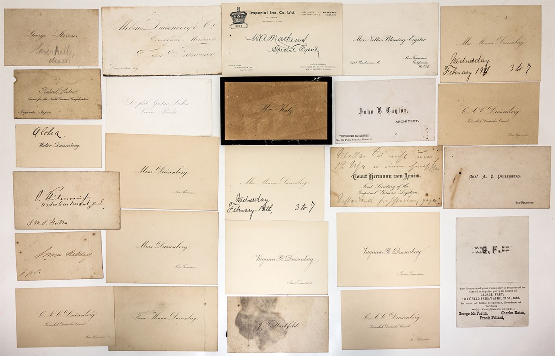 Calling cards from members from the Duisenberg family and others: Mrs. Minna Duisenberg (wife of Charles, and a writer of poetry), C. A. C. Duissenberg (from an article in the San Francisco Call, 1894: "Death of C. A. C. Duisenberg. Charles A. C. Dulsenberg, one of the best known German citizens of this city, died yesterday forenoon at his residence, 1031 Harrison street, he was in the seventieth year of bis age. Mr. Duisenberg arrived in San Francisco iv 1849. He came from Bremen in a sailing vessel and brought his house with him. He was at this time 25 years of age. In 1850 he formed a partnership with Mr. Moebius, the firm name being Moebins & Duisenberg. He held the position of German Consul for twenty-five years, and was also during that term the agent for the North German Lloyds, he also fought during the Mexican war. At one time he was president of the German General Benevolent Society, of which be had been a member for many years up to the time of his death. He leaves a widow, three sons and two daughters. His funeral will take place from his late residence tomorrow at 2:30 o'clock.")