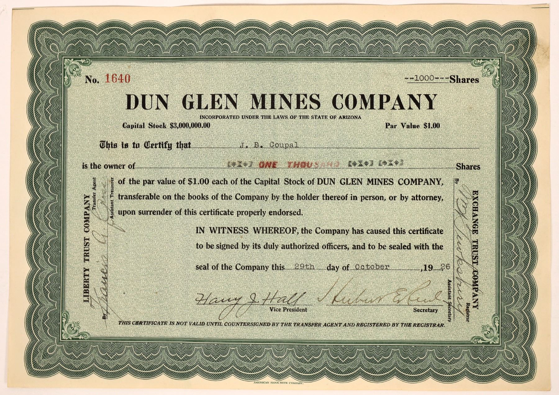 Issued 1926 Dun Glen Mines stock. Nevada Ken Prag Collection