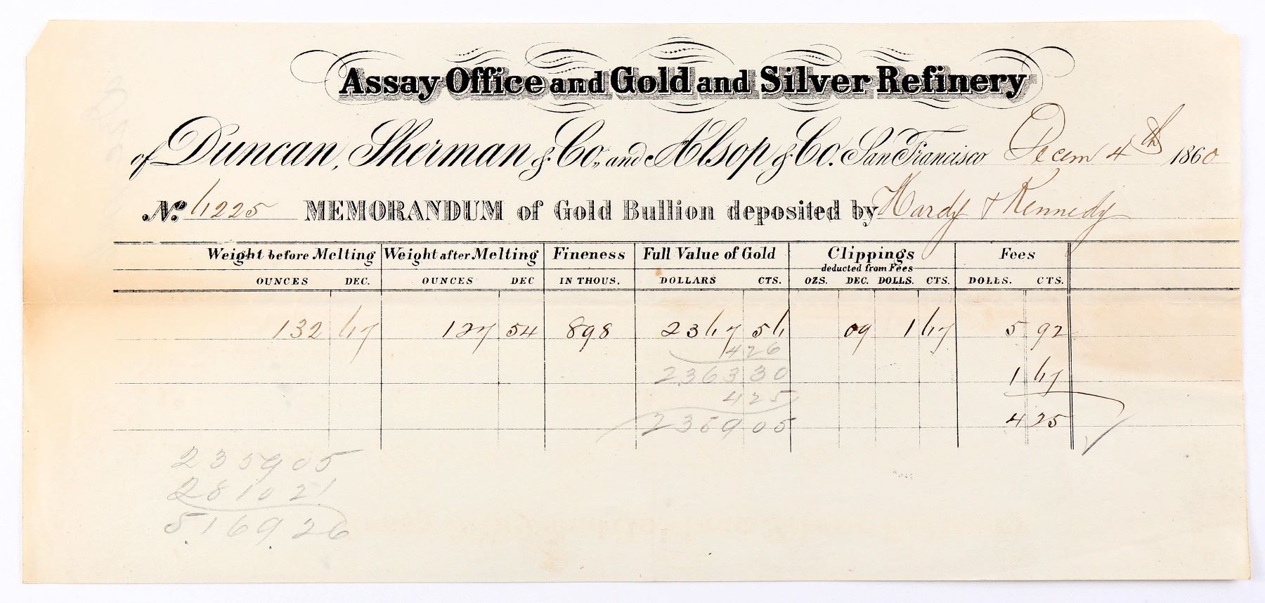 Duncan, Sherman & Co. and Alsop & Co., Assay Office and Gold and Silver Refinery, San Francisco, CA. Dec. 4th, 1860. Memorandum no. 6225 of Gold Bullion Deposited by Hardy & Kennedy. Weight before Melting 132.67 oz, after Melting 127.54 oz, Fineness .898, and a Net Value of $2367.56. According to Owen, Justh leased his assay business to Duncan, Sherman & Co. on March 1, 1860, some months earlier than this assay. Alsop & Co. was a long well-known merchant that was involved in a variety of trade in the West and with South America. A treasure chest bearing his name was found in the wreckage of the S.S. Central America Ship. He had an office in San Francisco and was a correspondent for the New York firm of Duncan, Sherman & Co. having a location on 411 and 413 California St. Justh continued on with the new company as Assayer until December 26, 1860, when E. Justh & Co. was the succeeding entity making these receipts ultra-rare. Later in the spring of 1859 Justh had moved his remaining San Francisco branch to 104 Montgomery St. opposite Wells Fargo & Co. and this is the same address for the above firm. The motivation for Jusths short lease to the New York banking firm could have been financially motivated. R8+. Size: 11 x 5 inches. San Francisco California 1860