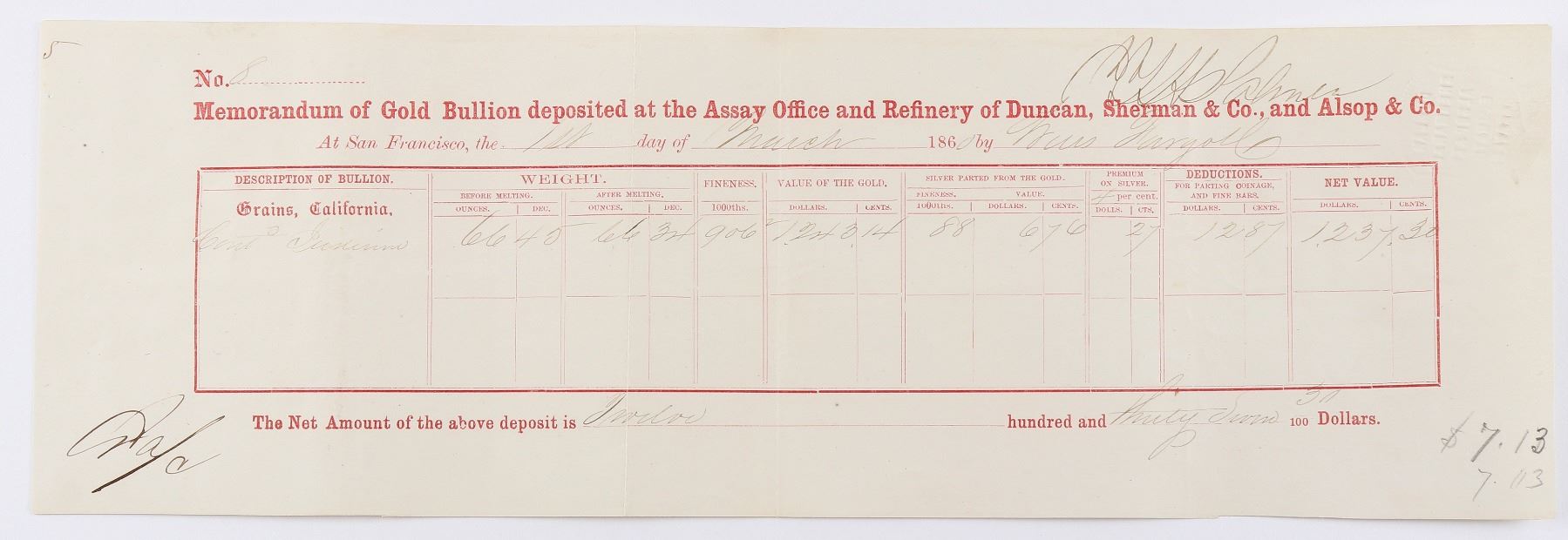 Duncan, Sherman & Co. and Alsop & Co., Assay Office and Gold and Silver Refinery, San Francisco, CA, 1-Mar-1860. No. 8 Memorandum of Gold Bullion Deposited by W. F. & Co. ñ Palmer. Creme colored paper with black print including the words ìDescription of Bullion and below that ìGrains California. Weight before Melting 66.40 oz, After Melting 66.34 oz, Fineness .906, and a Net Value of $1,237.30. There is a handwritten notation ìCont Iridium. Iridium, heavier than gold and belonging to the platinum group of elements, is found in meteorites in much higher abundance than in the Earth's crust. The unusually high abundance of iridium in the clay layer at the CretaceousñPaleogene boundary gave rise to the Alvarez hypothesis that the impact of a massive extraterrestrial object caused the extinction of dinosaurs and many other species 66 million years ago, now known to be produced by the impact that formed the Chicxulub crater located off the Yucatan Peninsula. The most unique aspect of this exceedingly rare assay receipt is a small 1 embossed shield located at the upper right-hand corner with the five lines embossed as follows: ìDuncan / Sherman & Co / Alsop & Co / E. Justh / Assayer. According to Owen, Justh leased his assay business to Duncan, Sherman & Co. on March 1, 1860, the date of this assay. Note the No. 8 being one of the first assays under the new management. Alsop & Co. was a long well-known merchant that was involved in a variety of trade in the West and with South America. A treasure chest bearing his name was found in the wreckage of the S.S. Central America. He had an office in San Francisco and was a correspondent for the New York firm of Duncan, Sherman & Co. having a location on 411 and 413 California St. Justh continued on with the new company as Assayer until December 26, 1860, when E. Justh & Co. was the succeeding entity making these receipts ultra-rare and very possibly the only example having the embossed company shield present. Later in the spring of 1859 Justh had moved his remaining San Francisco branch to 104 Montgomery St. opposite Wells Fargo & Co. and this is the same address for the above firm. The motivation for Jusths short lease to the New York banking firm could have been financially motivated. R8+. Duncan, Sherman & Co.: Duncan, Sherman & Co. was another of the New York banking companies that entered the California gold rush marketplace. The company did not, however, enter into the banking world directly by the establishment of banks in California, but rather into the gold bullion trading and assaying businesses. Their first foray into California came in January 1854, when Palmer, Cook & Co. could not pay the bond coupons of the California State bonds, and Duncan, Sherman & Co. stepped in and paid them, thus protecting the credit of the State in the eastern markets. A lengthy letter regarding this period of a private bank backing a State Bond is fully discussed in Cross Financing an Empire, (v1, pp174-5, 182-3). Clarke discussed the financial ties between Duncan, Sherman & Co. and Palmer, Cook & Co. in William Tecumseh Sherman, Gold Rush Banker (1969). Alsop & Co. was a long well-known merchant in San Francisco dating back to at least 1850 and was the San Francisco correspondent for the New York firm of Duncan, Sherman & Co., having a location on 411 and 413 California St. at this period of time. Size: 13 x 4.25 inches. San Francisco California 1860