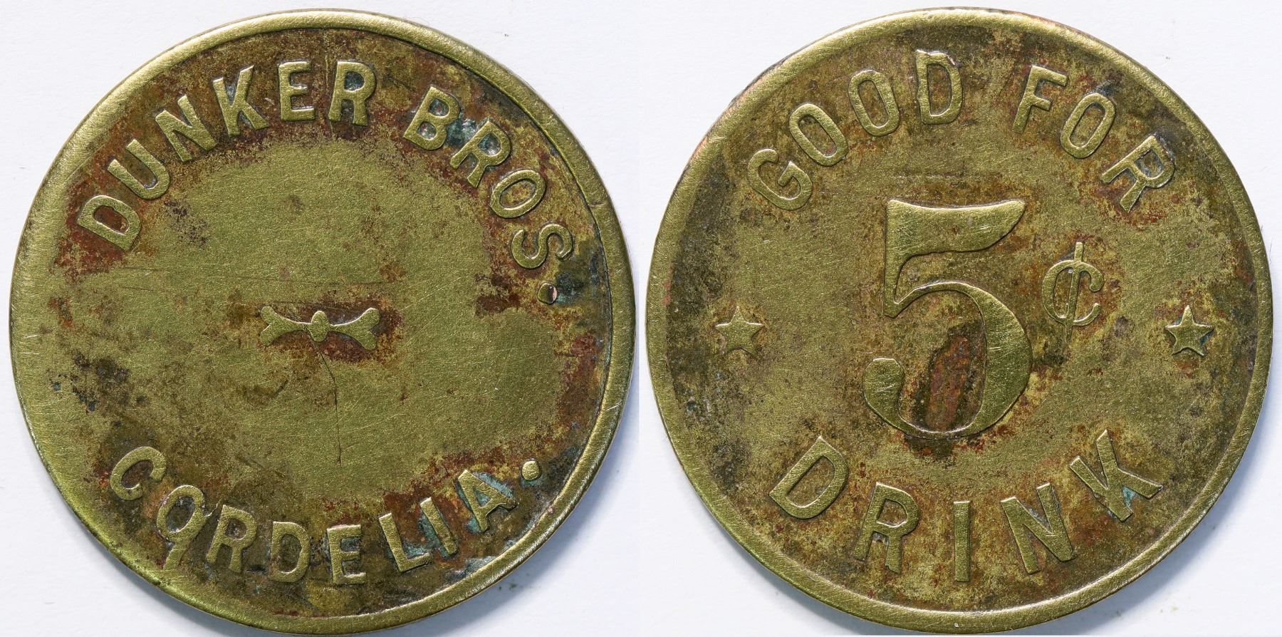 Dunker bros./ Cordelia.//GF 5c Dirin. Br, rd, nickel size. X-Lerch Collection. Xrare. Cordelia is now a very popular place along I-80 at the junction of the road to Napa and 680, the road to Walnut Creek etc. The old town is a bit south of Cordelia Junction.