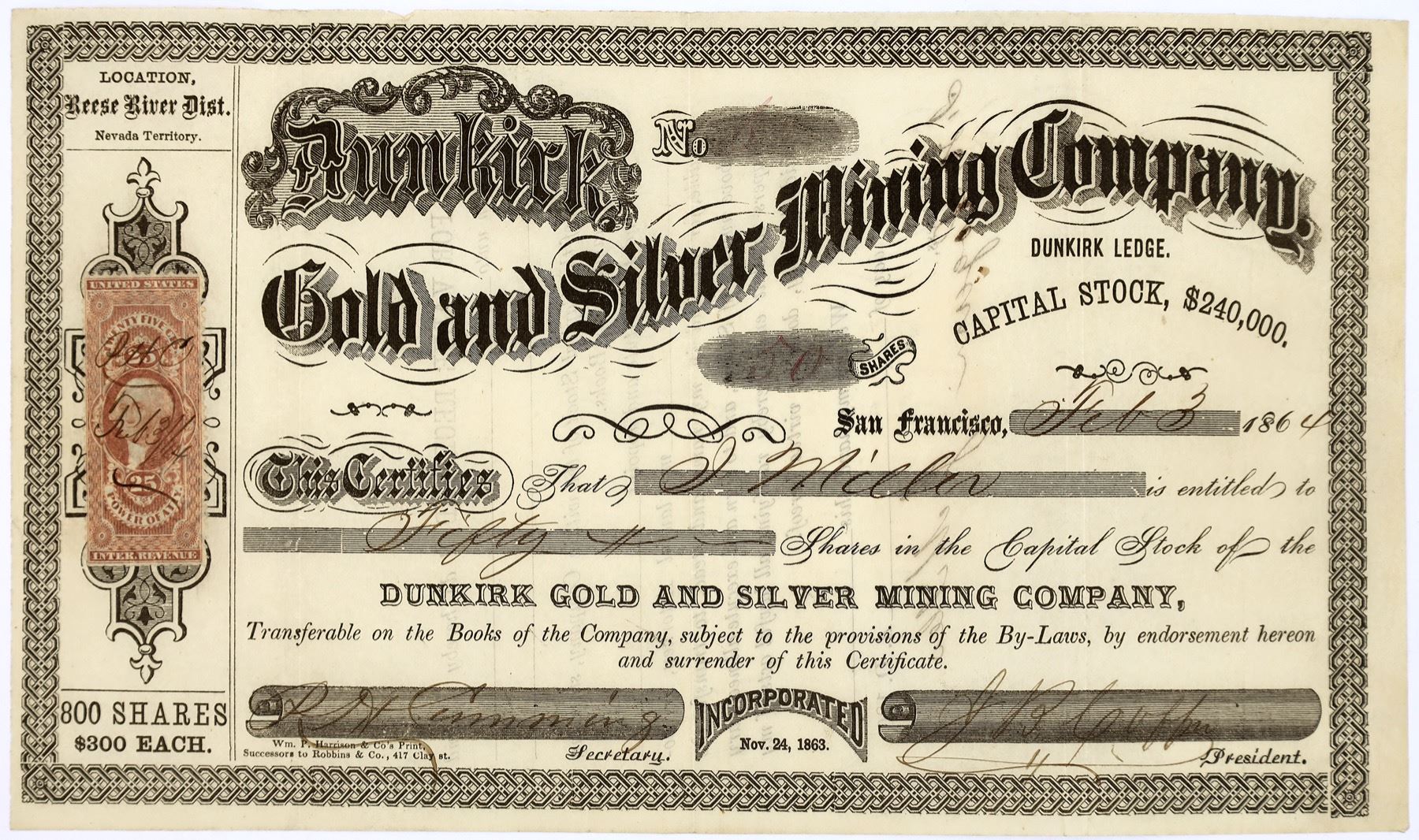 # (faded) for 50 shares to J Miller. Signed by PH Cumming and president JB Coppin. Dateline San Francisco 1864. Incorporated November 24, 1863. 25c Power of Att'y revenue stamp. Not cancelled. Location: Dunkirk Ledge, Reese River District, Nevada Territory. Printer Wm. P. Harrison - successor to Robbins & Co. Slight discoloration from signature bleed-through on back. No corner, edge, or pin hole issues. An assessment was issued on April 13, 1864. This is one of three stocks with the same dateline, incorporated date, secretary, stockholder, style of stock and printer in the sale when it was purchased. On December 9, 1863 the Fountain Mill at Jacobsville reported crushing ore for the Dunkirk [Gold Hill News]