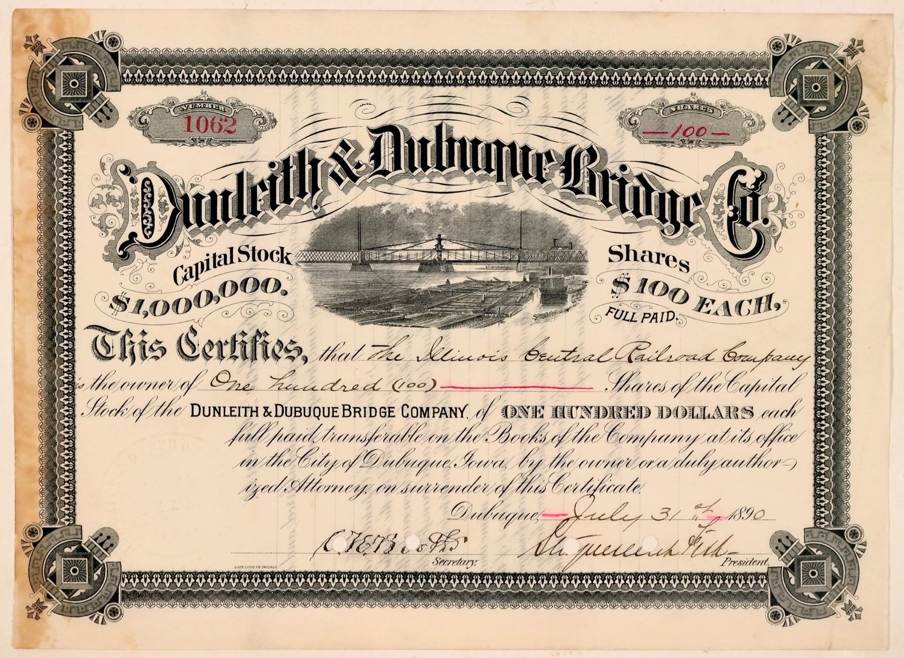 Beautiful certificate issued in 1890 for 100 shares to The Illinois Central Railroad Company. Nice vignette of a long bridge across the river with a lighthouse behind it. Signed by Stuyvesant Fish as president. Fish became president of the Illinois Central Railroad from 1887 to 1906. He was ousted by E.H. Harriman and joined forces with Jay Gould and the Missouri Pacific. There are hole cancels thru the signatures, but overall this is a much better than average example of this one.