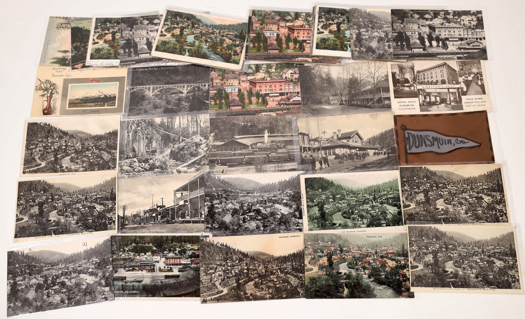 Lot of 47 including a leather pc. No RPPC or PMC. These are all early divided back era. In addition to many bird's-eye views, there are also views of: Southern Pacific depot; cave springs; Hotel Weed; Hotel Upper Soda Springs; Sacramento River; state highway bridge; and a street scene with wagons. Duplication. Dunsmuir is located in Siskiyou County, California, founded by the Central Pacific Railroad in the 1880s. The official city slogan is "Home of the best water on Earth". Important Northern California station for Central and later Southern Pacific Railroad. State:California City:Dunsmuir Date: Provenance: Ken Prag Collection