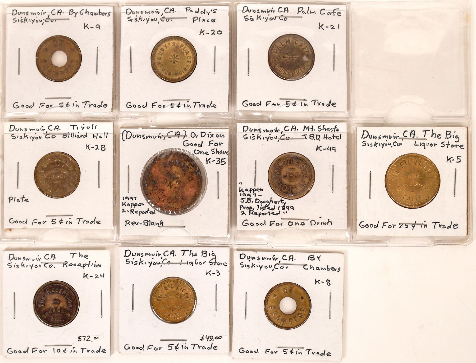 10 Dunsmuir tokens. 2 Chambers, Paddy's Place, Palm Cafe, Tivoli Billiard Hall, O Dixon, Mt. Shasta Hotel, 2 The Big Liquor Store, The Reception. Dunsmuir California