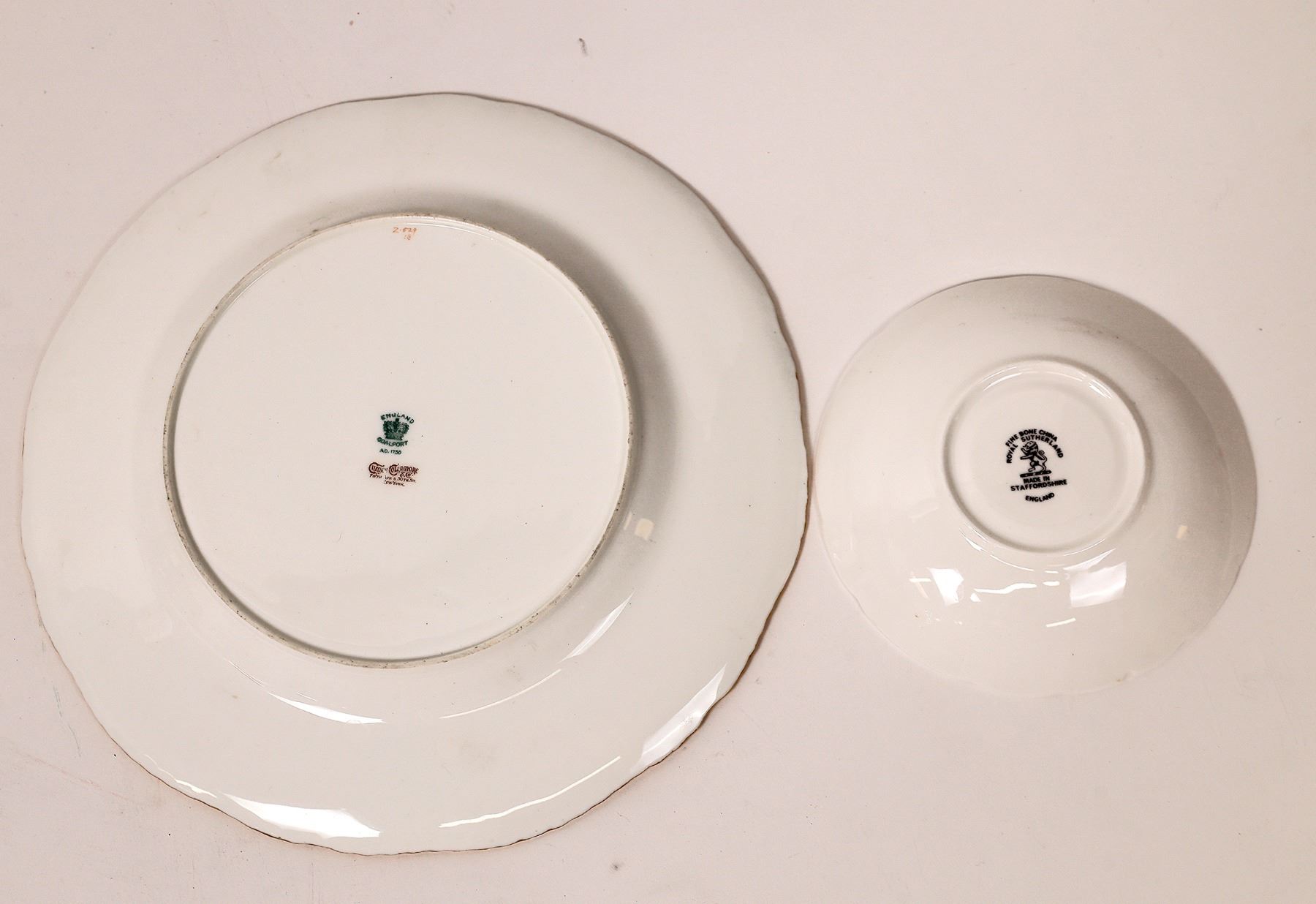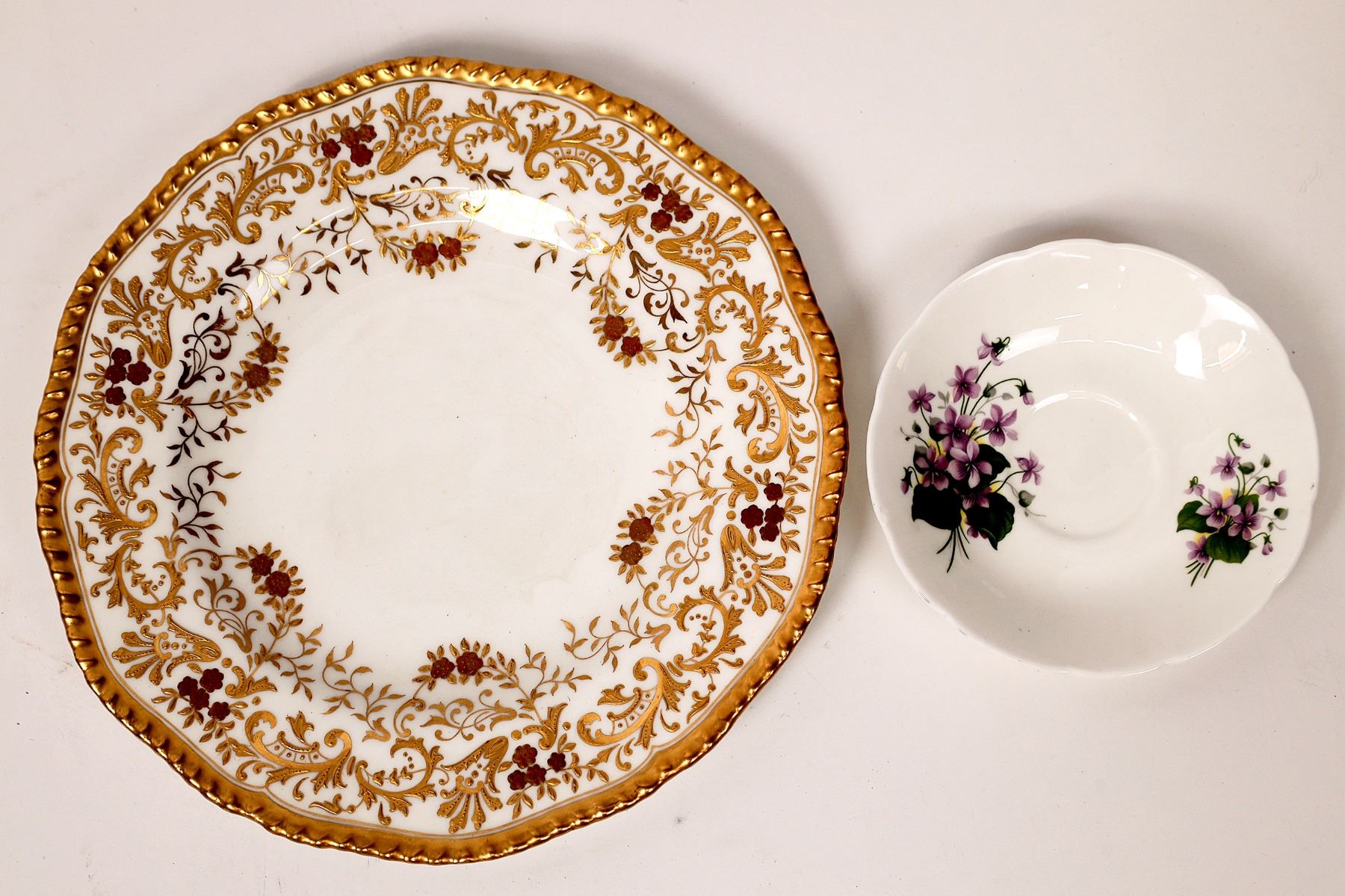 Includes 2 different collectible China plates. 1. Fine Bone China Royal Sutherland saucer Made in Staffordshire, England. Petite purple floral pattern. 2. Coalport Porcelain Dinner Plate with the Standard Crown mark c. 1881-1939. Made in England. Fancy gilded floral pattern. Please see photos.
