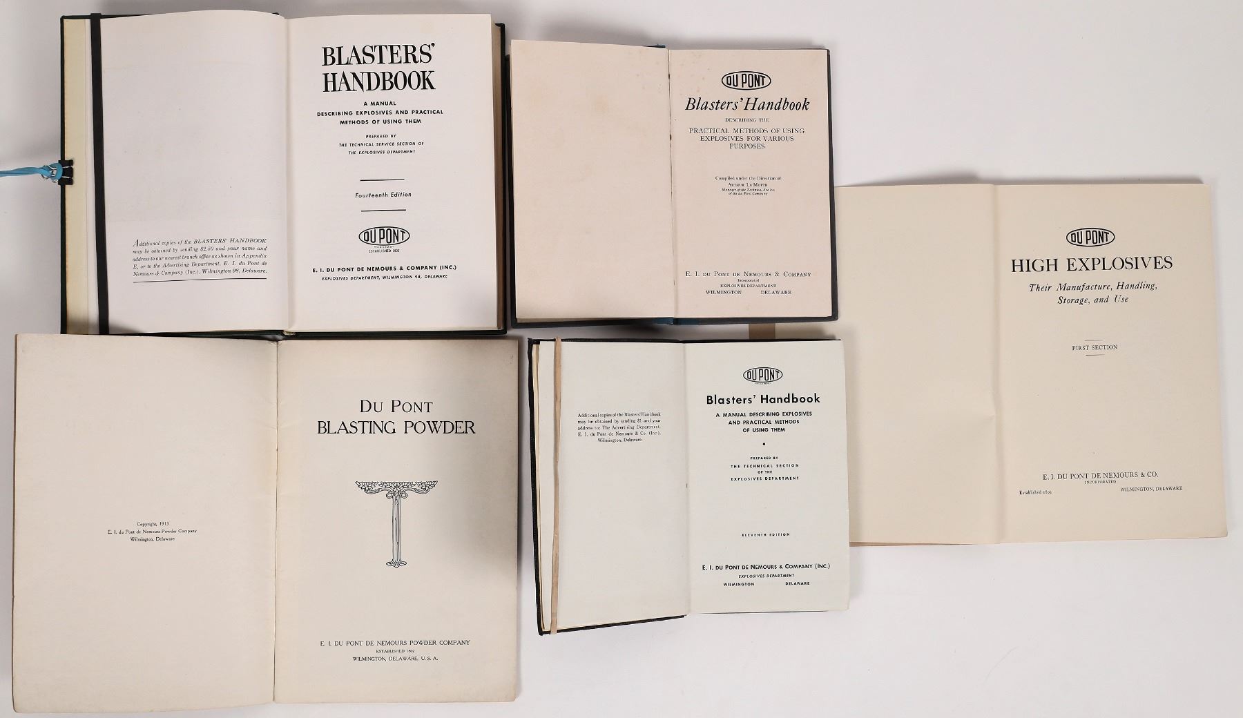 3 Dupont Blasters' Handbooks, 1922, 1942, 1958. Dupont Blasting Powder 1913 with blue writing on cover. Dupont High Explosives Catalog 1920 Franklin Collection. GO TO THE BOOKS SECTION OF THIS AUCTION FOR OTHER IMPORTANT MINING REFERENCES AND MINING-RELATED WORKS.
