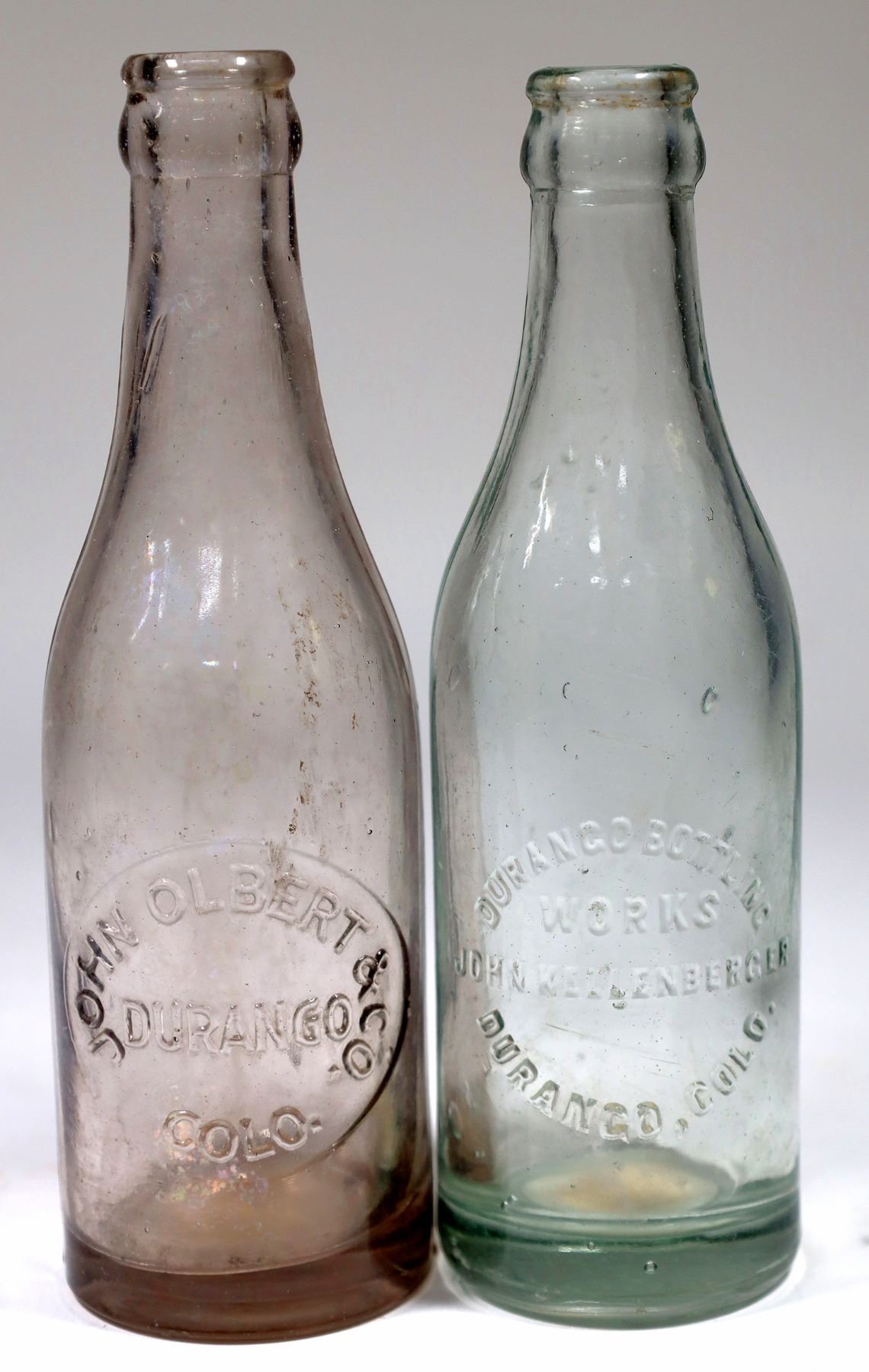 2 Durango crown tops. Unlisted clear John Olbert & Co./Durango/Colo. 5/8" base chip. # 160 Very light lime Durango Bottling Works/John Kellenberger/Durango, Colo. 2 bruises.