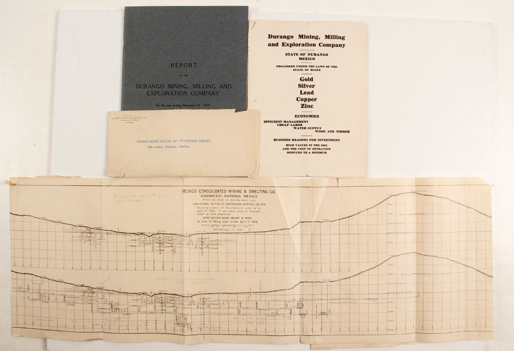 1. Durango Mining, Milling and Exploration Co, organized under he laws of the State of Maine, prospectus and annual report for the year 1910. Prospectus is 14 pages with maps of the various holdings in overall good, but fragile condition. Annual report id excellent condition with some very nice black and white photos of the period. Complete details of eh company assets totaling 38 pages not including the cover. Also included is an envelop form Consolidated Securities of Boston to Durango Mining, milling and Exploration, which is not dated and fair condition.